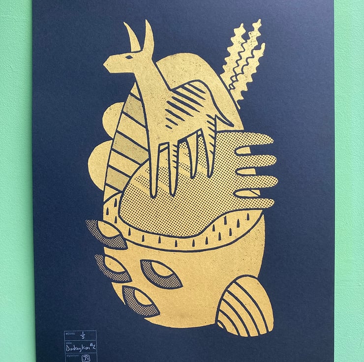 Gold Aqua Art ink on recycled black Seawhite 280gsm acid-free paper. From an edition of only 5, signed, stamped, titled and numbered. The print started out as a linocut. I then added the halftones (spotty bits), before printing the edition as a screen-print.