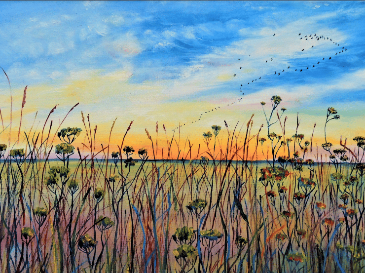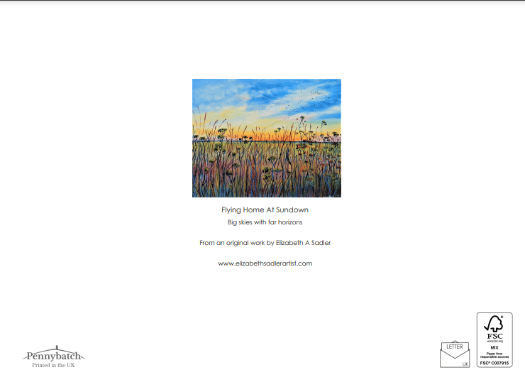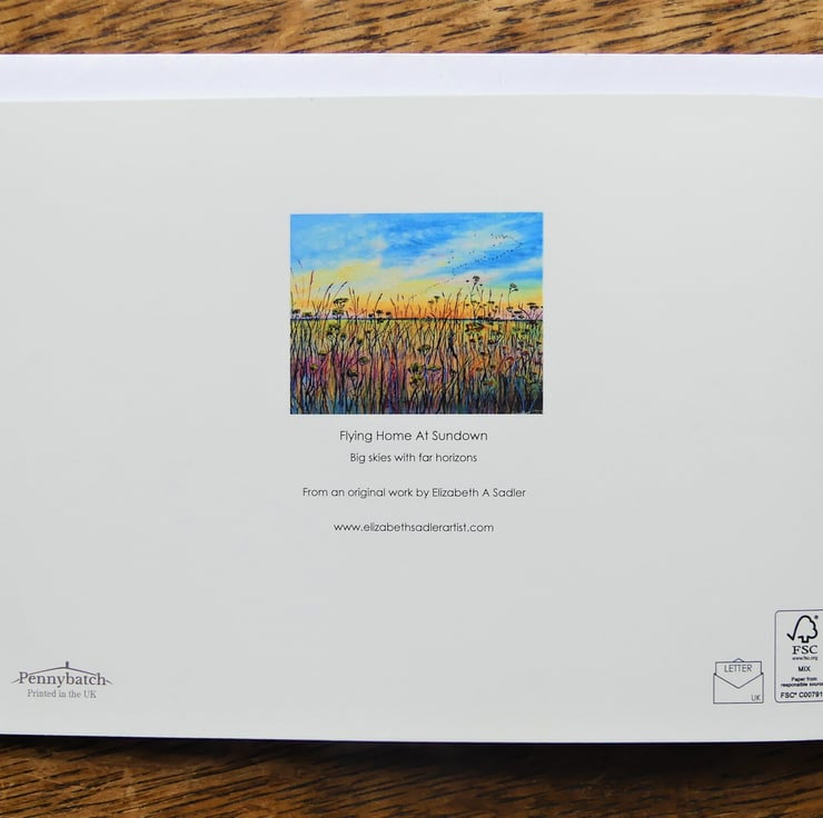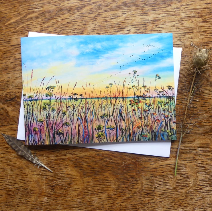 A5 Landscape blank fine art greeting card 148.5 x 210mm printed on FSC semi-gloss paper produced from an image taken from my own original oil fen landscape painting of late summer meadow flowers and grasses at dusk as birds fly to roost
