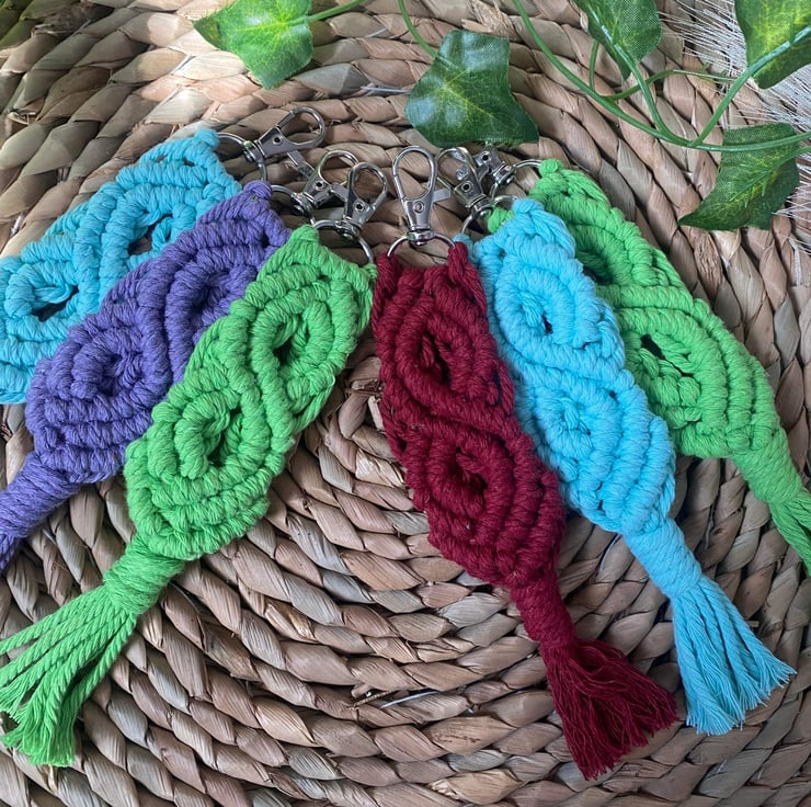 Made from 3mm macrame cord attached to a D shape lobster clasp keyring as seen in the photos.