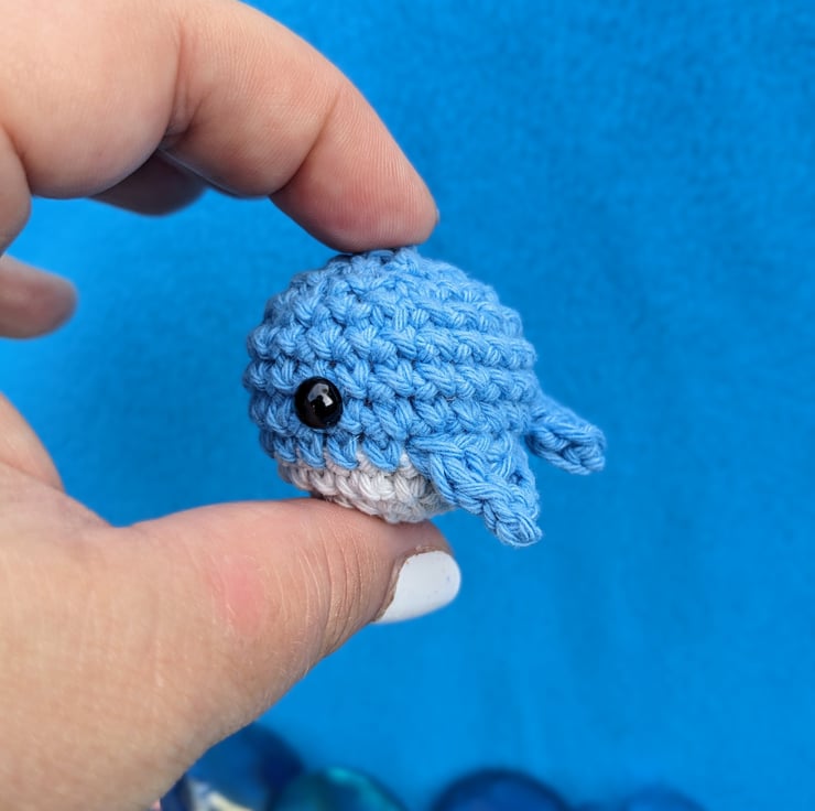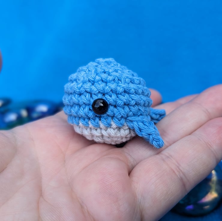 Each teeny whale friend is hand made from cotton yarn, fiberfill stuffing and plastic safety eyes (note: not recommended for under 3s).