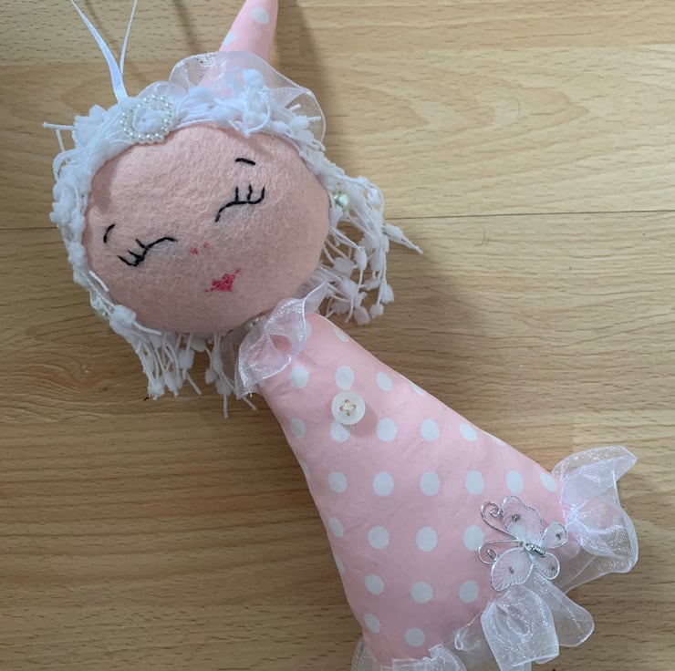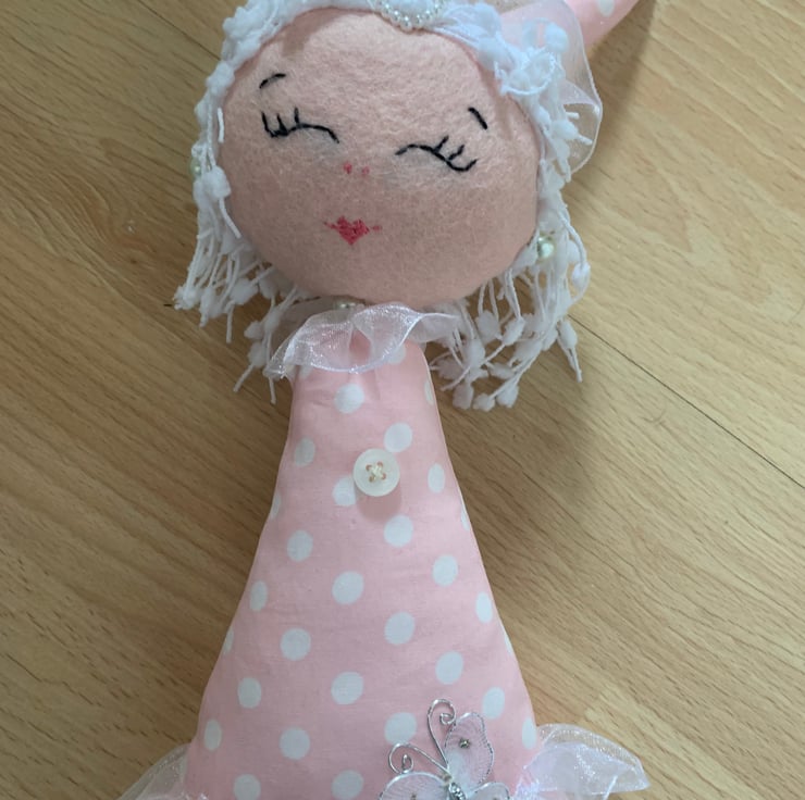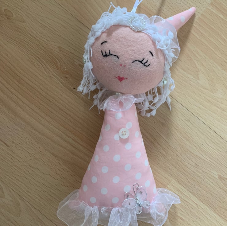 This beautiful Dangle doll is approximately 21 cm tall she has an attached silk ribbon. Her face has been hand embroidered onto felt, her hair is made from white bobble wool. She wears a pink and white polka