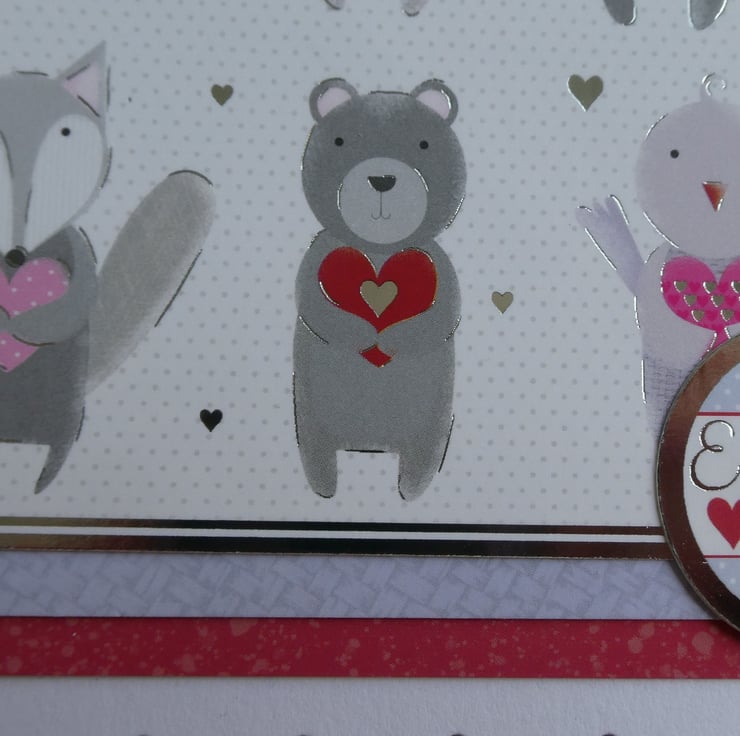 The main printed image shows a monkey, rabbit, badger, fox, bear and chick all holding hearts all with silver foiled accents.