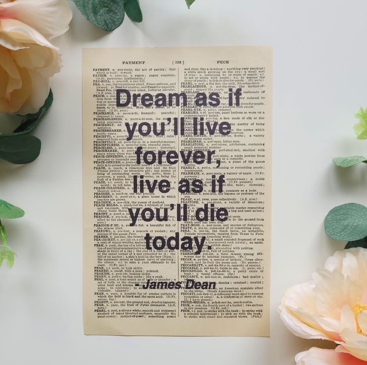 Combining inspiring/motivational quotes with vintage dictionaries. All quotes are printed onto genuine pages taken straight out of vintage English dictionaries to create a chic and inspiring product.
