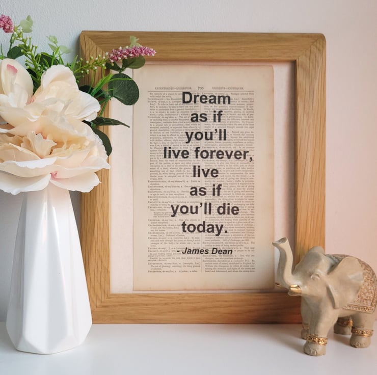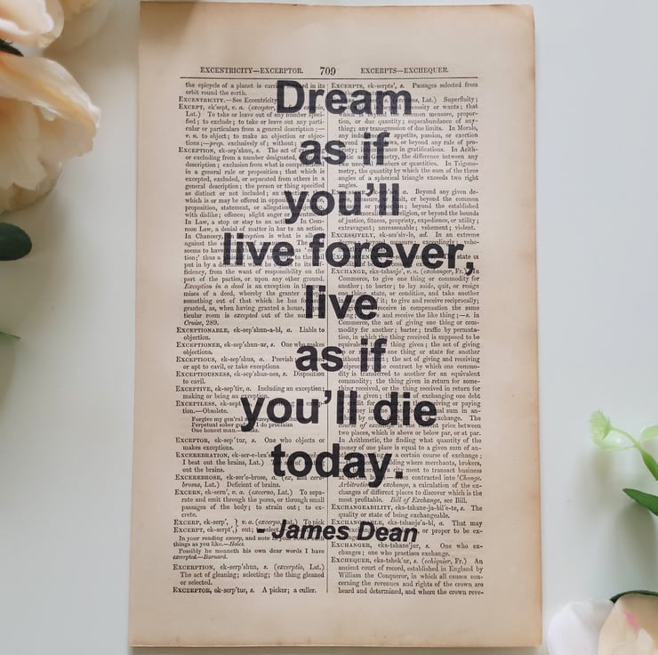 Combining inspiring/motivational quotes with vintage dictionaries. All quotes are printed onto genuine pages taken straight out of vintage English dictionaries to create a chic and inspiring product.