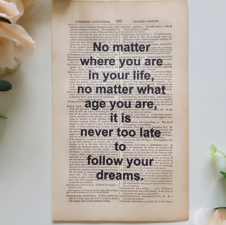 Combining inspiring/motivational quotes with vintage dictionaries. All quotes are printed onto genuine pages taken straight out of vintage English dictionaries to create a chic and inspiring product.