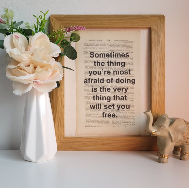 Combining inspiring/motivational quotes with vintage dictionaries. All quotes are printed onto genuine pages taken straight out of vintage English dictionaries to create a chic and inspiring product.
