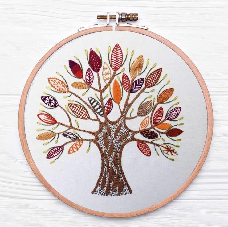 This is great fun to do and suitable for all levels. The tree measures approx 6.5 inches so the design fits well in a 7 inch hoop.