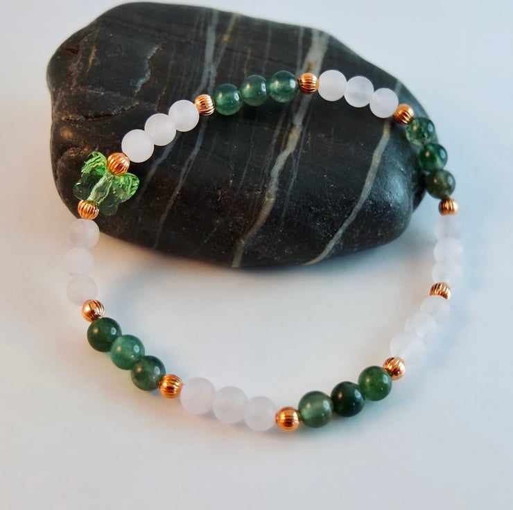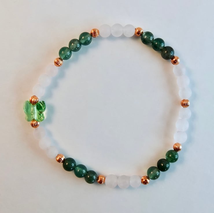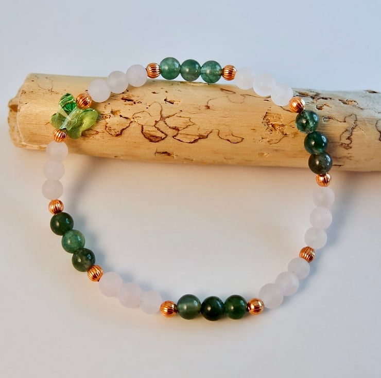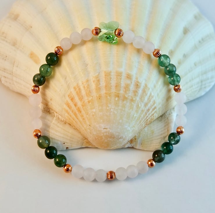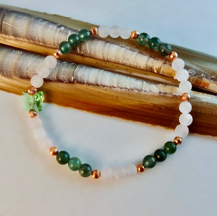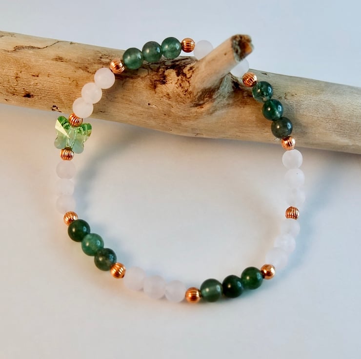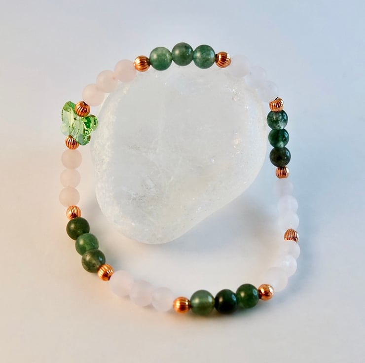 Moss Agate And Rose Quartz Bracelet With Swarovski Butterfly - Handmade In Devon