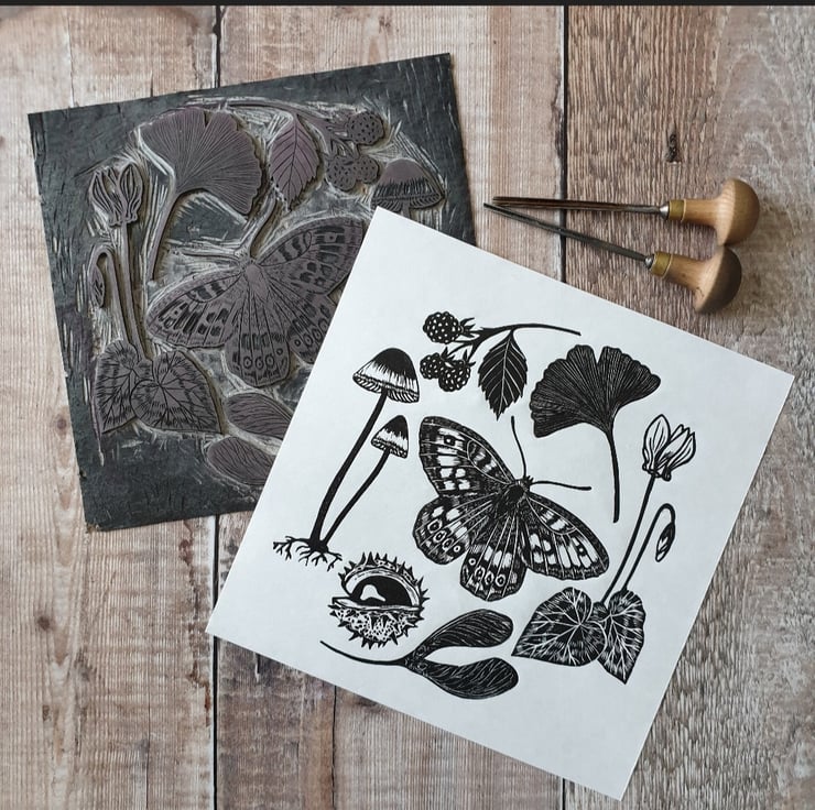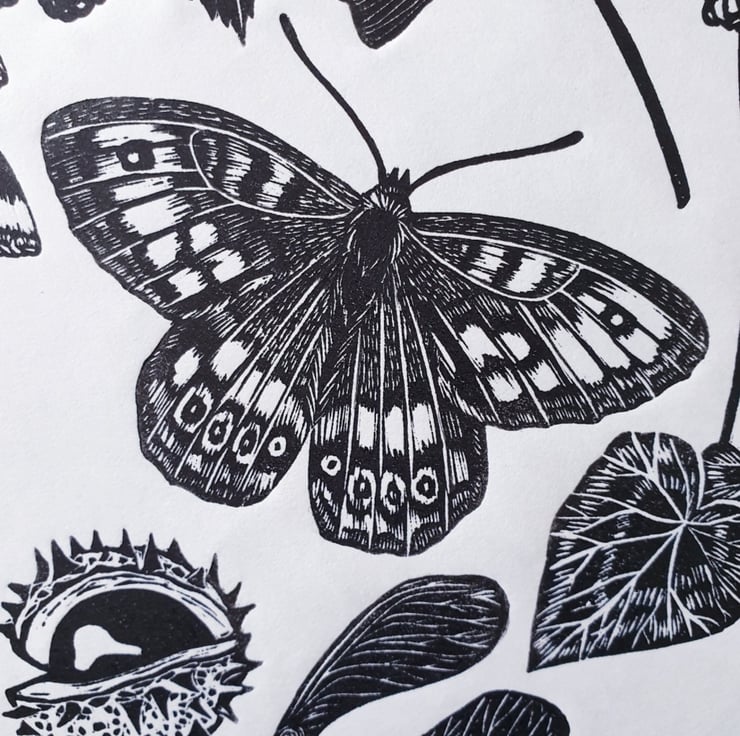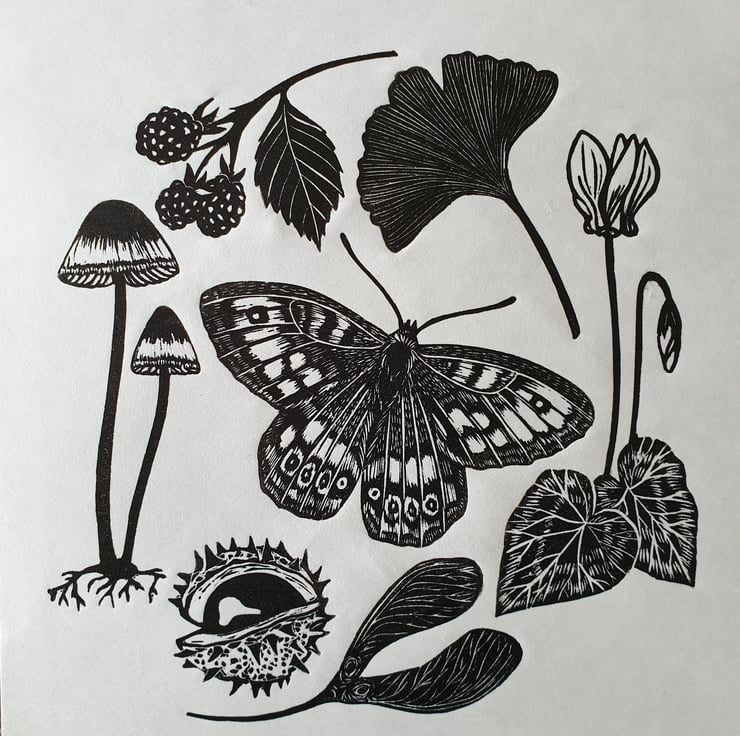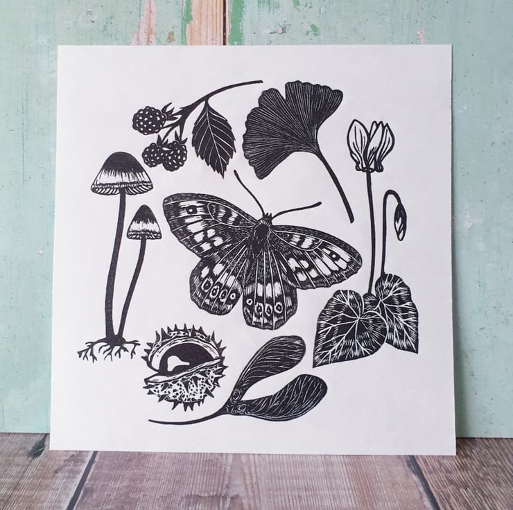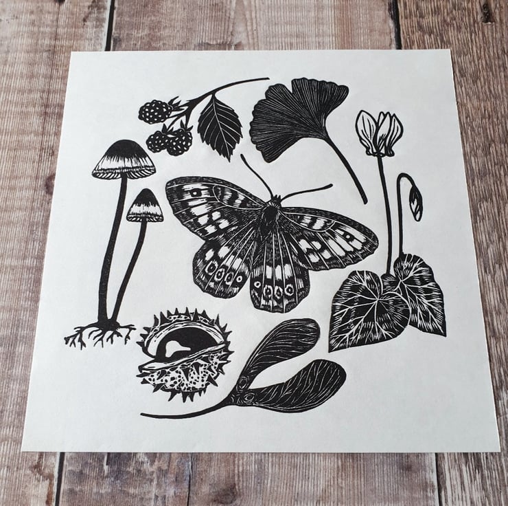 Hand carved and printed linocut illustration of things you see on a nature walk in the UK. The print features a butterfly, berries and leaves amongst other things - all my favourite autumn sights!