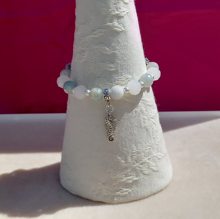 Aquamarine beads meet white glass rondelles and silver tone spacer beads in this very pretty bracelet. The aquamarine beads are facetted 8mm beads and are strung on jeweller's elastic. There are two seashell shaped beads to add to the marine vibe and a little seahorse is suspended from a charm bail with a swirl pattern. This will fit a 7 - 7.5 inch wrist.