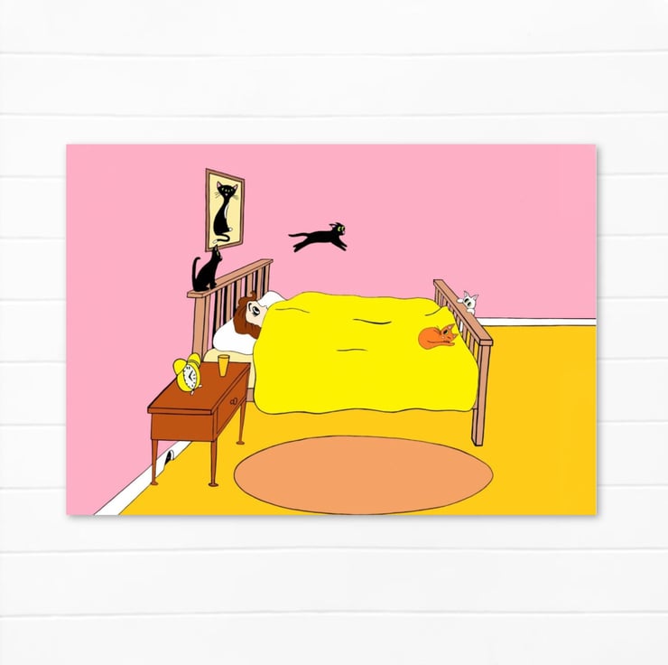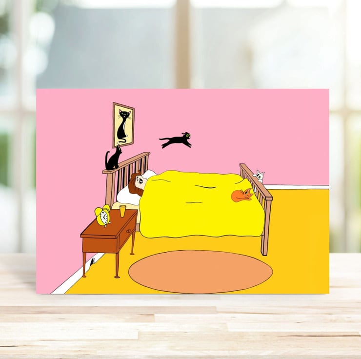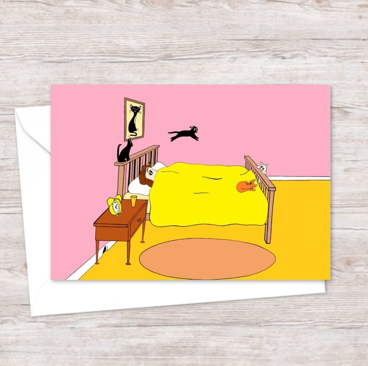 An original art greeting card featuring a hand drawn illustration of some flying cats!