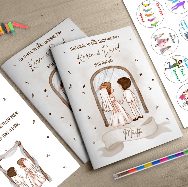 The front of each booklet can be customized with the child's name, the names of the bride & groom, and the wedding date.