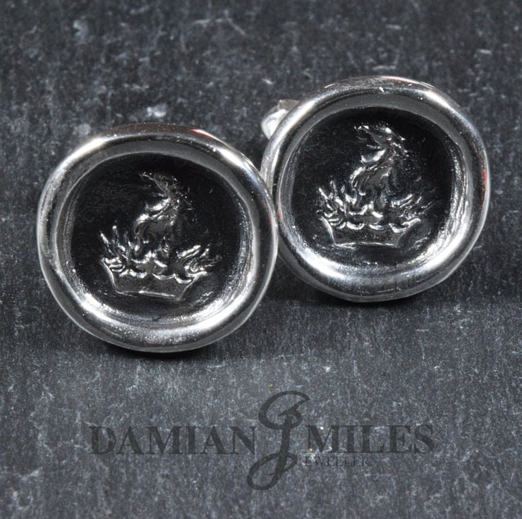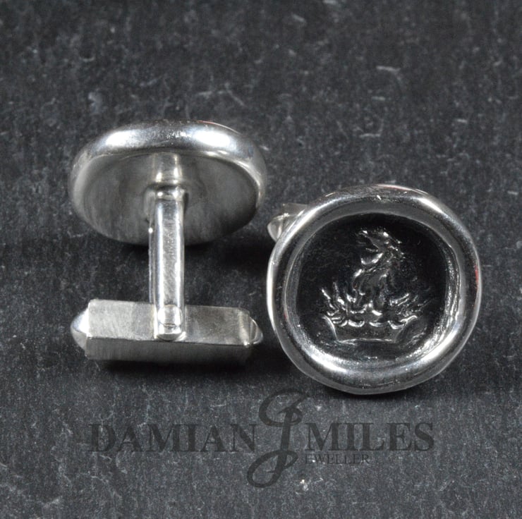 This pair of Sterling Silver cuff links is taken from an impression of a genuine, antique, seal engraving of a Phoenix rising through a coronet.
