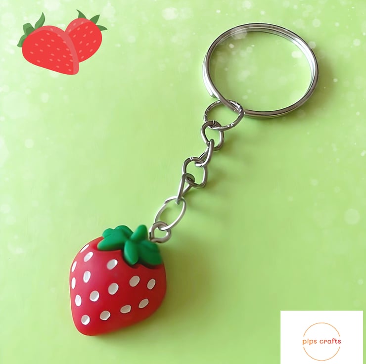 A silver keychain with a fun red strawberry attached