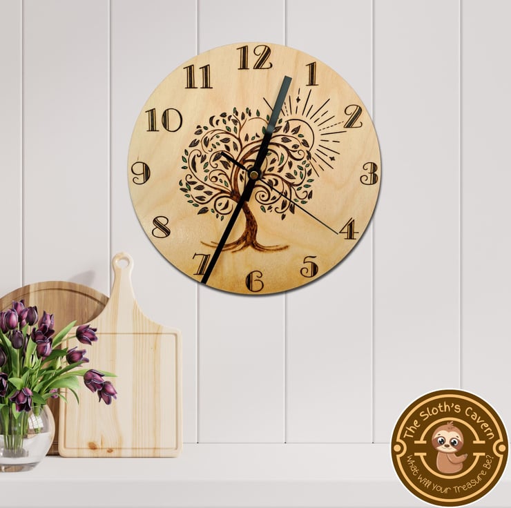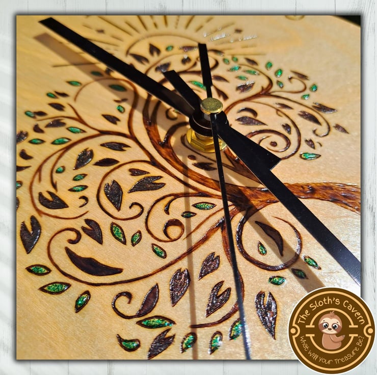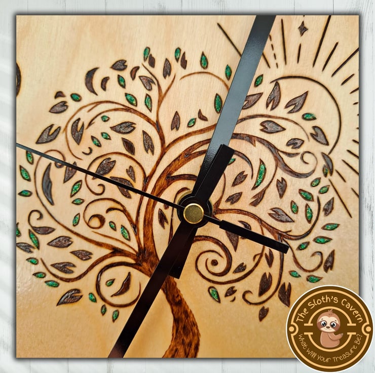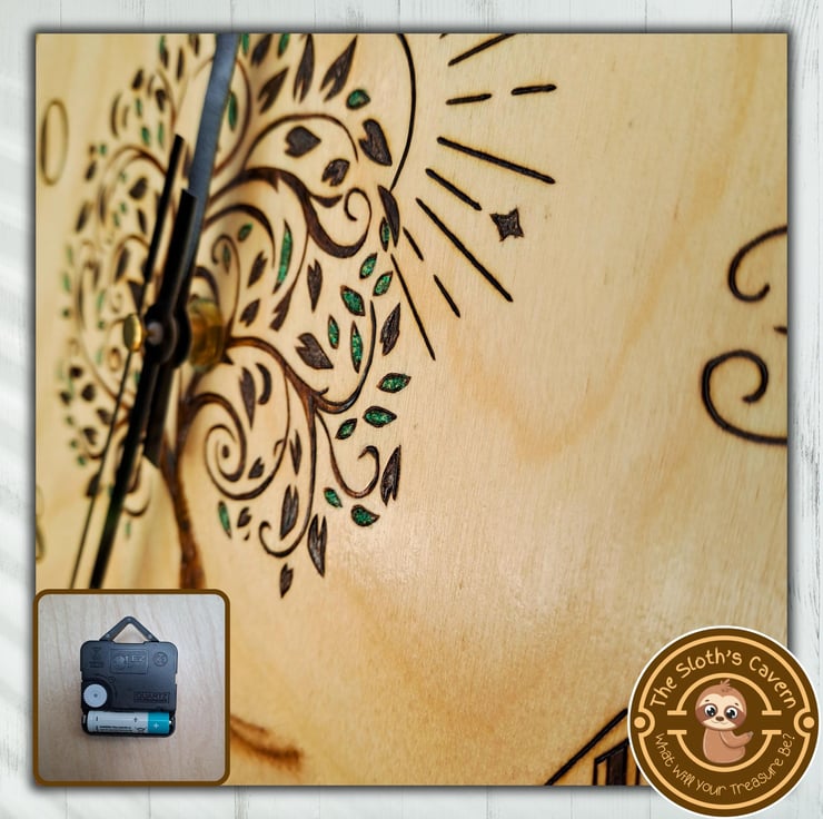 Hand turned Birch Plywood, decorated with the method of pyrography (wood burning), displaying the Tree Of Life and the sun. The clock also displays all 12 numbers that represent the hours. While the whole image is hand burnt, some of the leaves have been filled with green glitter colour drop embellishments, to give a touch of colour and dimension.