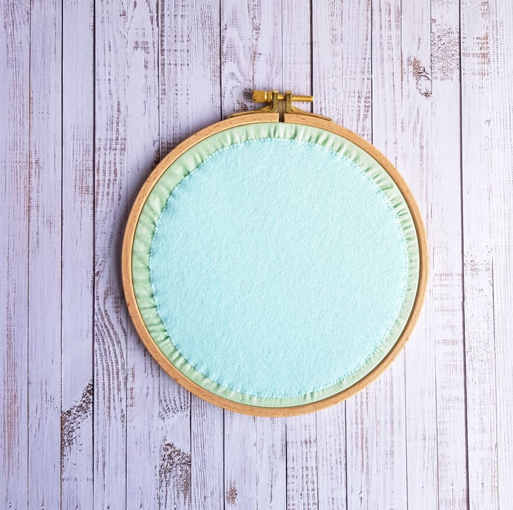 Mounted in a 6.5" (approx 17 cm) embroidery hoop.