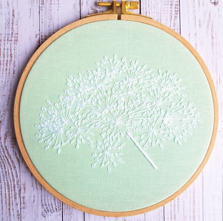Fresh spring colours to lighten your décor. Delicate white seed heads hand embroidered on a mint green background.