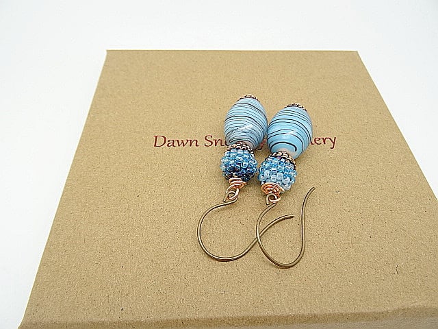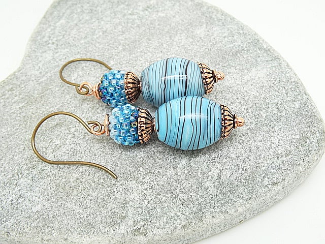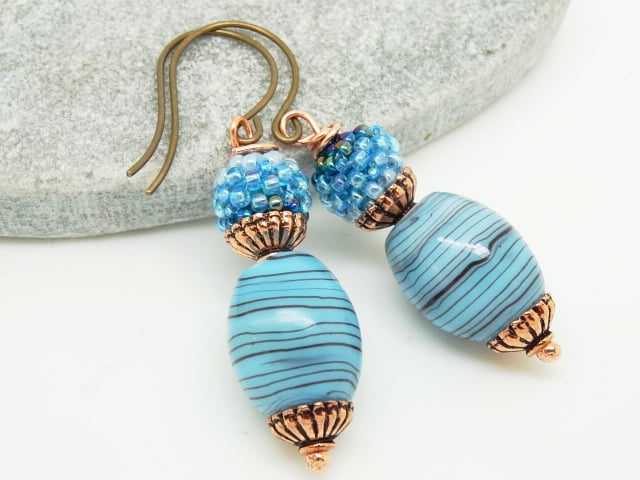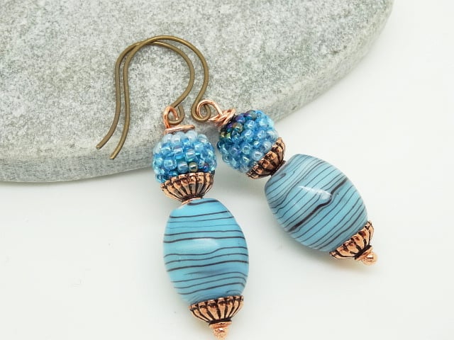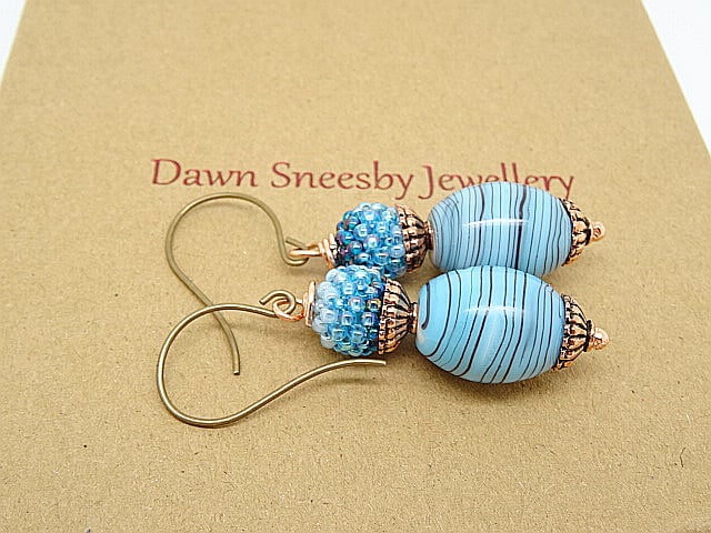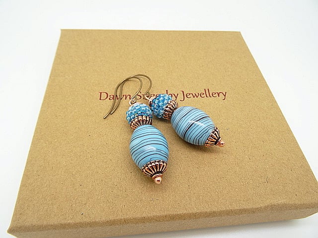 These are lovely earrings made with high quality Czech Glass beads. I have used striped Czech glass barrel beads in shades of blue measuring 20 x 15mm to these I have wired 10mm Czech glass, stitched bead balls in 2 shades of blue.These are both capped with the most lovely fluted design copper bead caps. The earrings measure 2.25 inches (6cm) from top of Vintaj brass, nickel free, round loop ear wires.