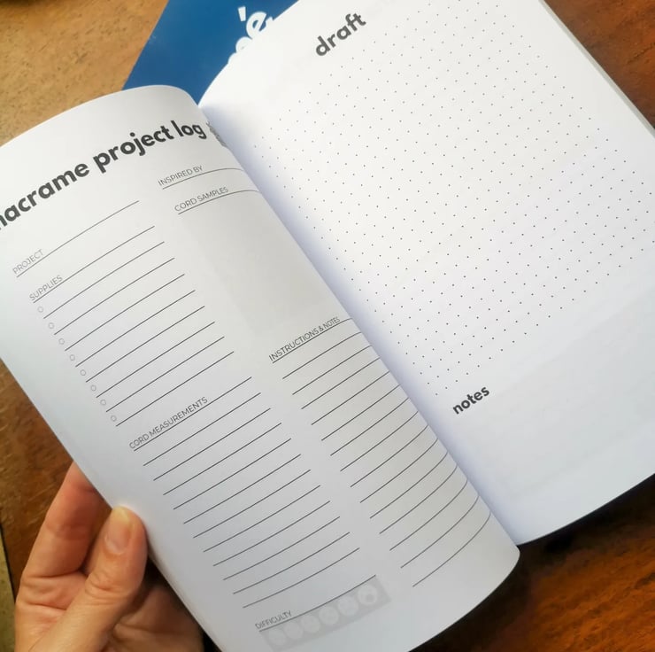 Name your projects and assign their difficulty. Determine the supplies you need, such as macramé cord, dowels, rings, and beads. Add notes if needed. There is also a small space to attach cord samples for future reference.