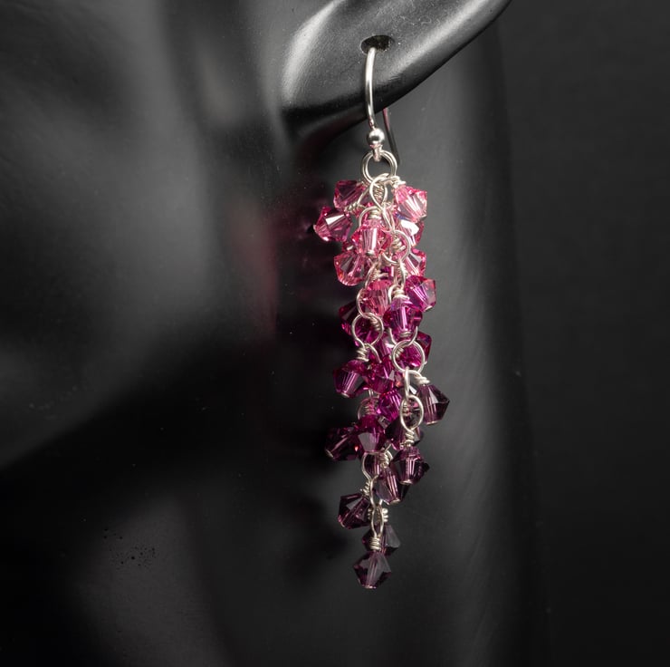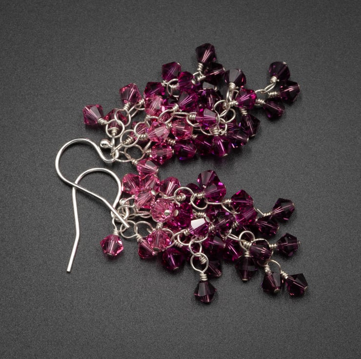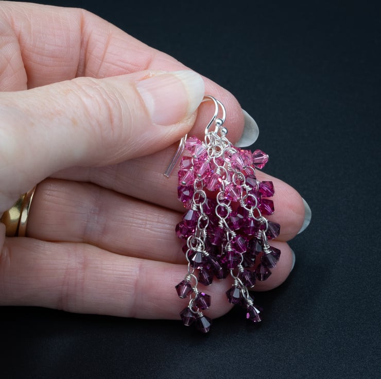 4mm sparkling bicones in shades of pinks and purples are individually wrapped onto sterling silver pins and linked together to form a cascade of colour.