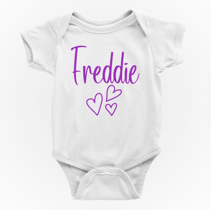 Personalised Shortsleeve Baby Grow -- Personalised Name (and 3 hearts)