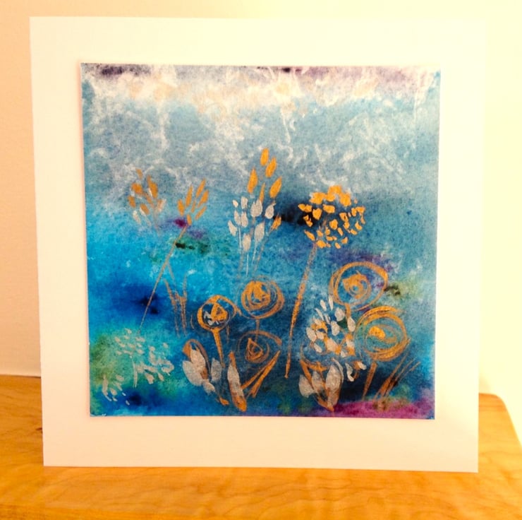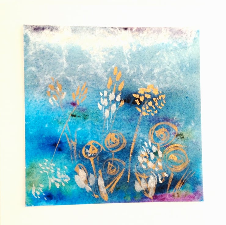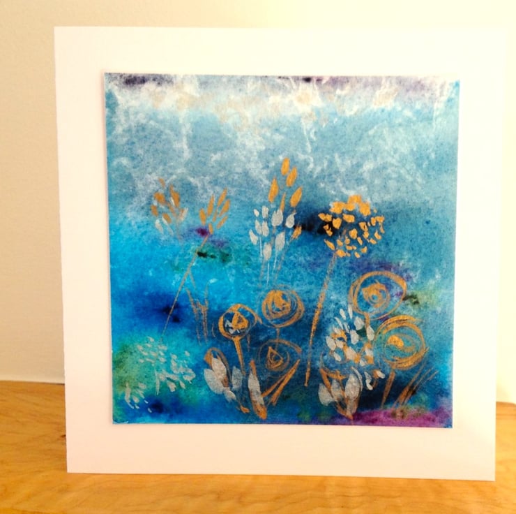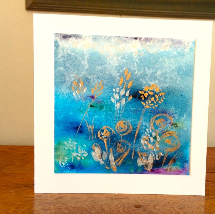 Using greens, turquoise, blues, pinks, purples, golds & silver watercolours, I've painted this on a Bockingford 250LB (535GSM) watercolour paper, a really nice textured thick paper which I've then mounted onto white card.
