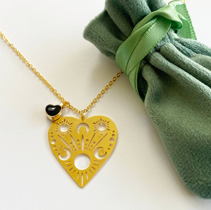 Laser cut 24ct gold plated heart charm, with a sun and moon decoration. Accompanied by a pretty black enamel heart charm.