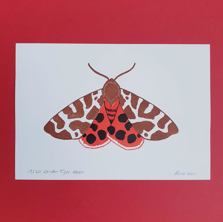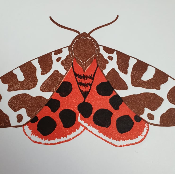 Original linocut print of a Garden Tiger moth. My print has been made using 3 hand carved lino blocks for each colour and has been printed by hand. It is printed in brown, rich orange-red and black on smooth off white colour Canaletto paper.