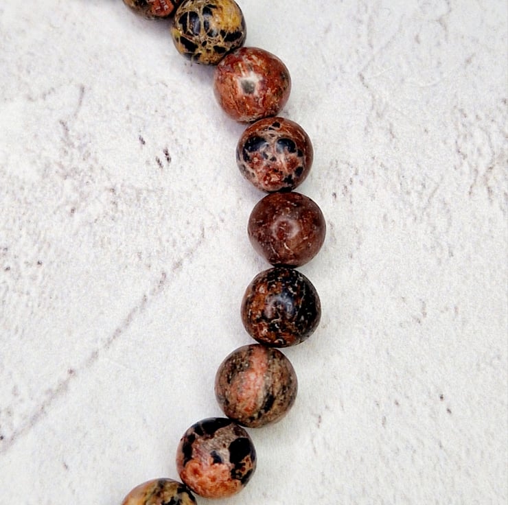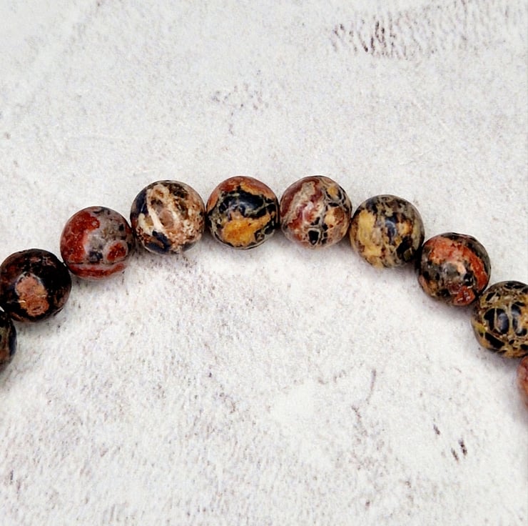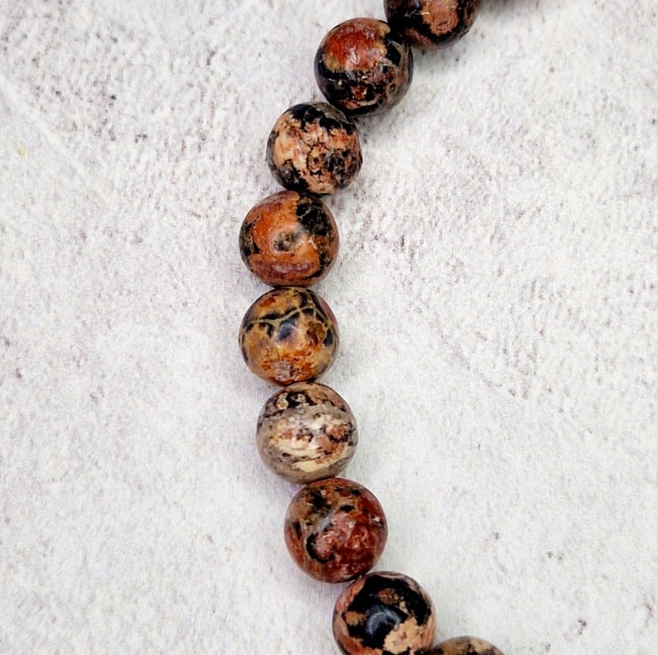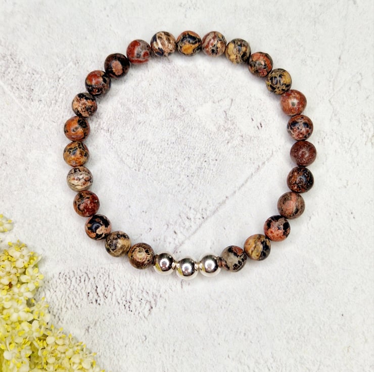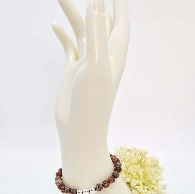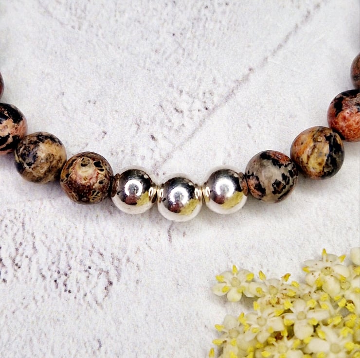 The bracelet is 18 cm and is made of 6 mm leopardskin beads that have a soft sheen. Each bead is different, they are a mix of dark and light earth tones with overlaid swirls of rust, grey, peach and cream, with a central motif of 3 plain 6 mm smooth silver beads. All the silver components used in this bracelet are made of sterling silver.
