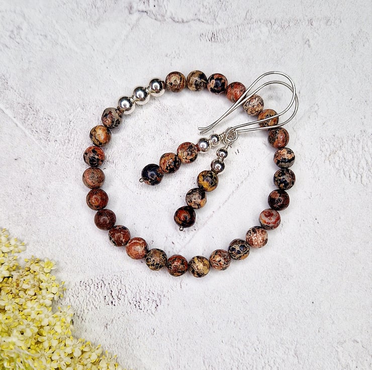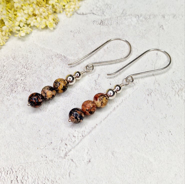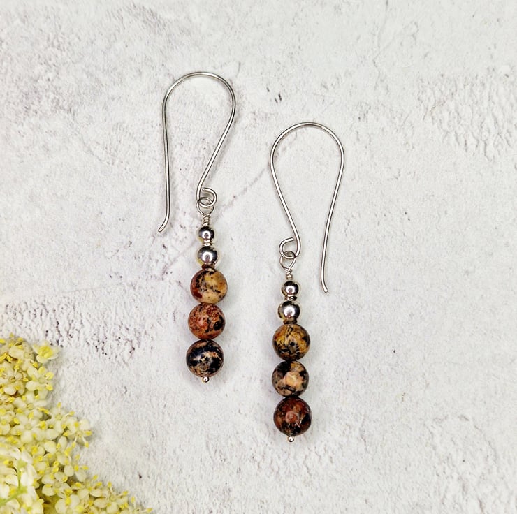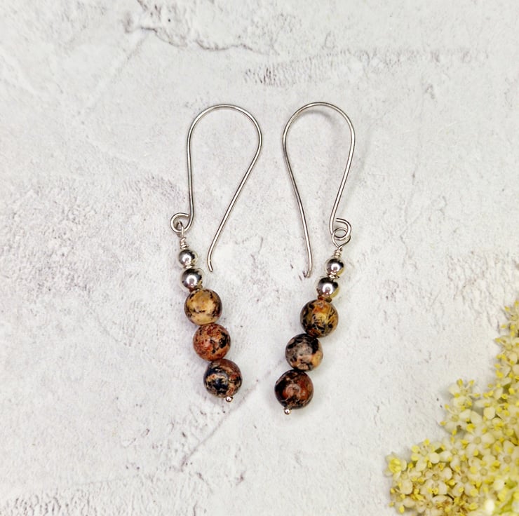 The long earrings are made 6 mm leopardskin jasper beads that have a soft sheen. Each bead is different, they are a mix of dark and light earth tones with overlaid swirls of rust, grey, peach and cream.