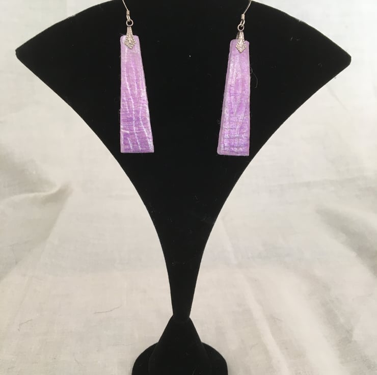 These handmade earrings are created using a clay base with a pressed textured surface and then coated with a pearlised satin sheen coating. These are a one-off design and are very light and fun to wear.
