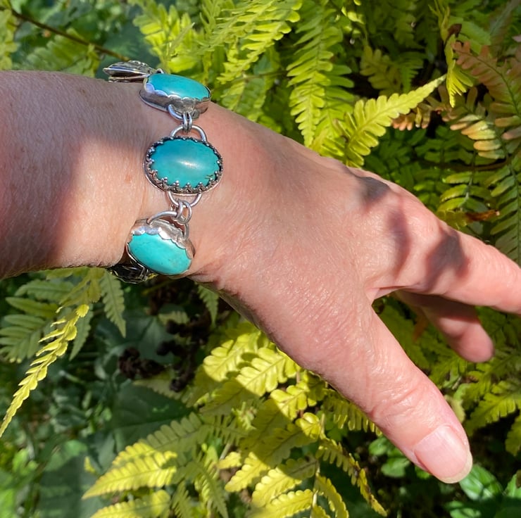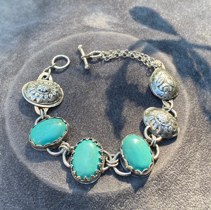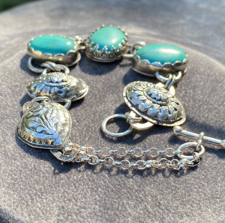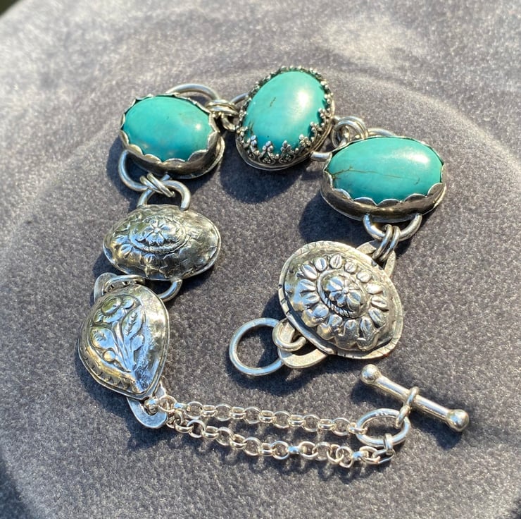 One of a kind ‘Showstopper’ bracelet made from sterling and fine silver with natural turquoise from the Ma’anshan mine. The silver elements were formed in antique goldsmith dies from my collection. The bracelet measures 7 1/2 inches but can be adjusted to your preferred length by shortening or lengthening the chain. Let me know what size you require via Options and I will adjust it before shipping.