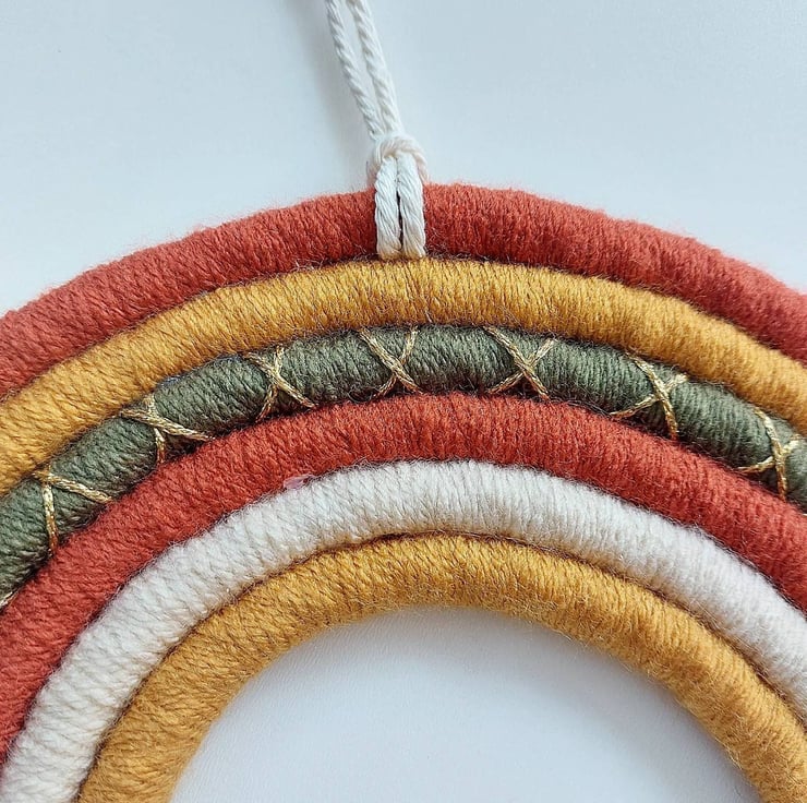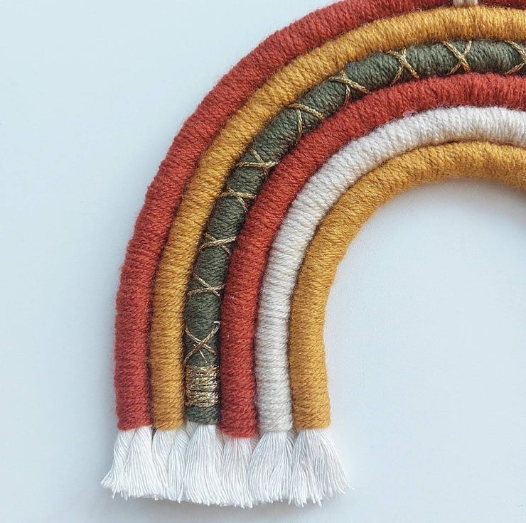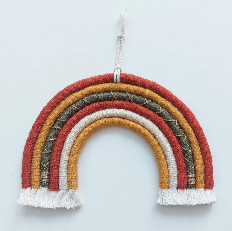 This rainbow is made using a mix of cotton macrame rope, premium acrylic yarn and metallic thread. The colour scheme consists of shades of copper rust, mustard, oatmeal and khaki green. I have then wrapped a metallic gold thread against the green to really make it pop!
