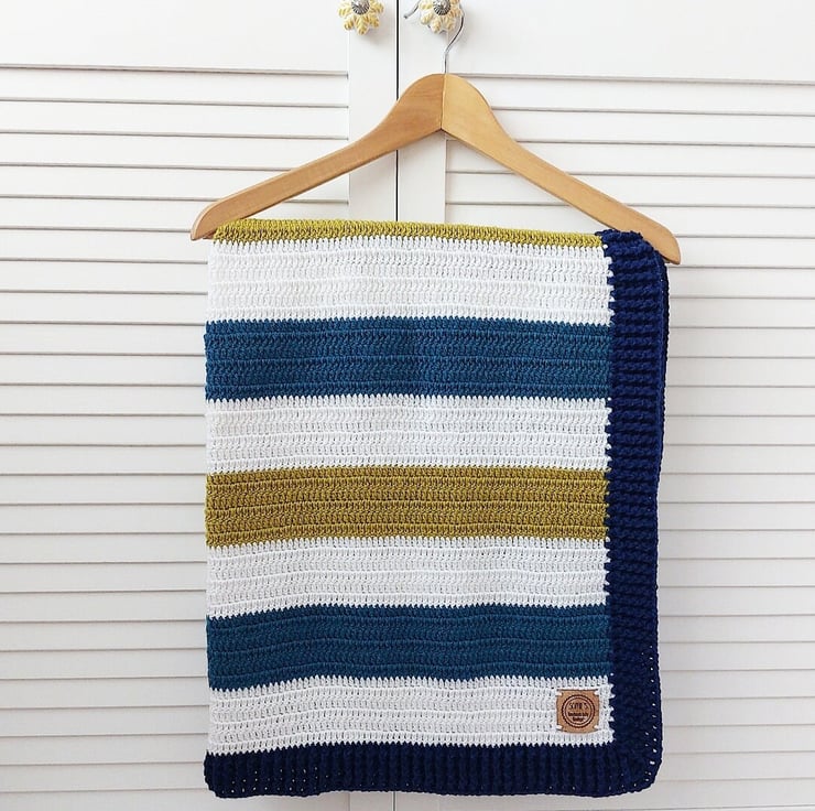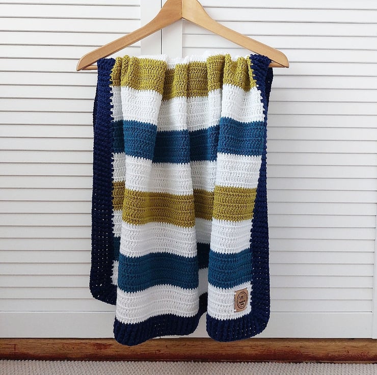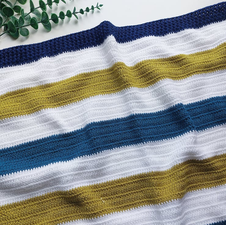 A beautiful and unusual green, deep petrol blue and a contrasting white create the main part of the blanket, while the dark blue textured border finishes it off beautifully!