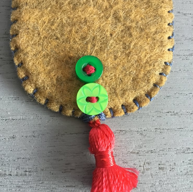 This embroidery is on honey coloured felt, edged with blue Blanket Stitches, with two green buttons and a red tassel at the bottom. It’s 6.50 inches long by 2 inches wide (15.50 cms by 8 cms). A stiff card is inside, making a firm bookmark….. to fit any book.