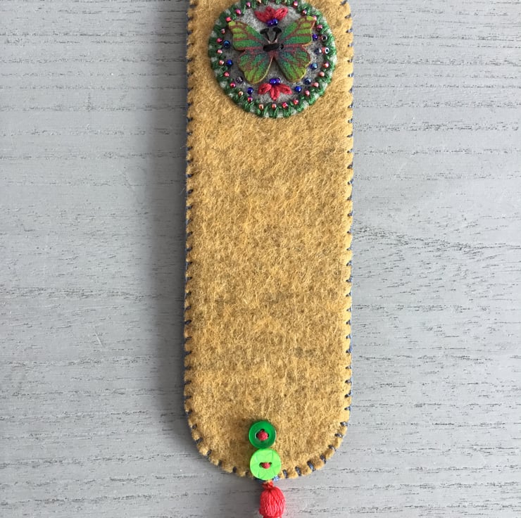 This Hand Embroidered Butterfly Button Bookmark has a lovely green and blue wooden Butterfly button, stitched onto a grey felt circle, with hand embroidered green Fly Stitches, decorated with small red beads. This Butterfly flutters over flower petals, hand embroidered in red Lazy Daisy Stitches, decorated with small blue beads.