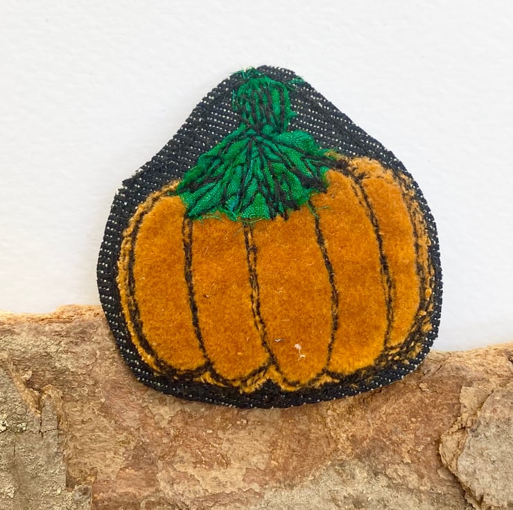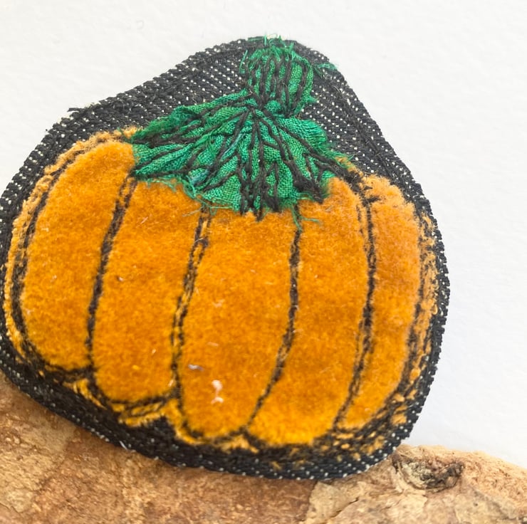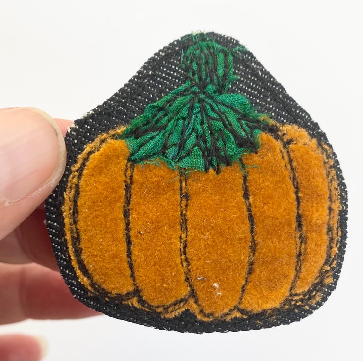 This beautiful handmade free motion embroidered pumpkin brooch is made from up-cycled fabrics. It is denim backed, and has a brooch pin on the reverse to keep it nice and secure. It measures 5.5 x 5cm approx.