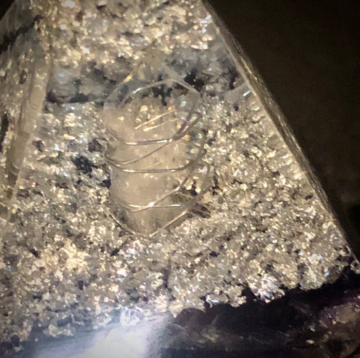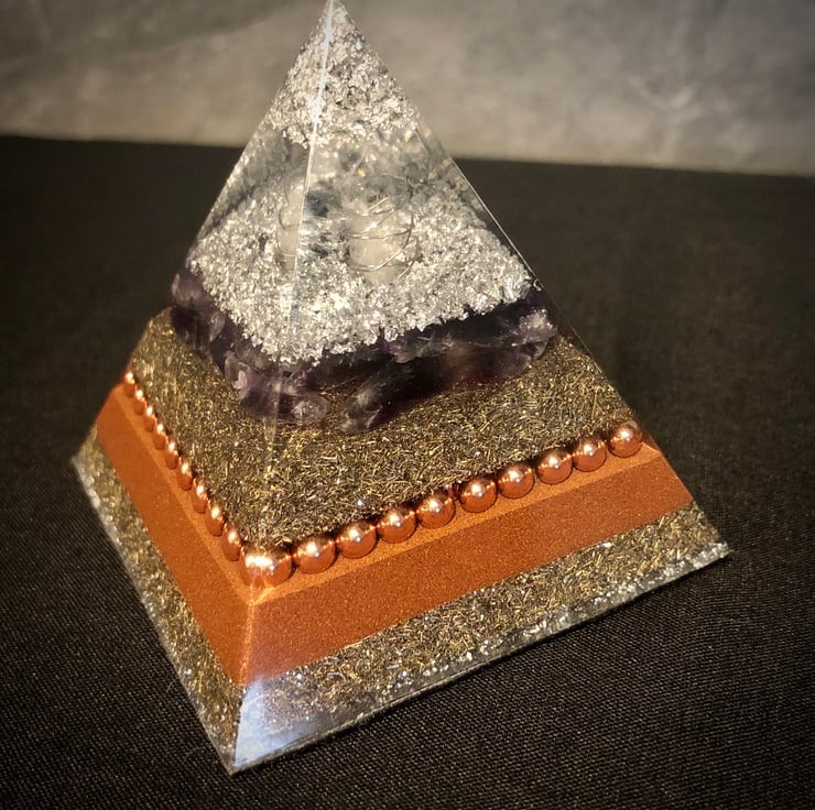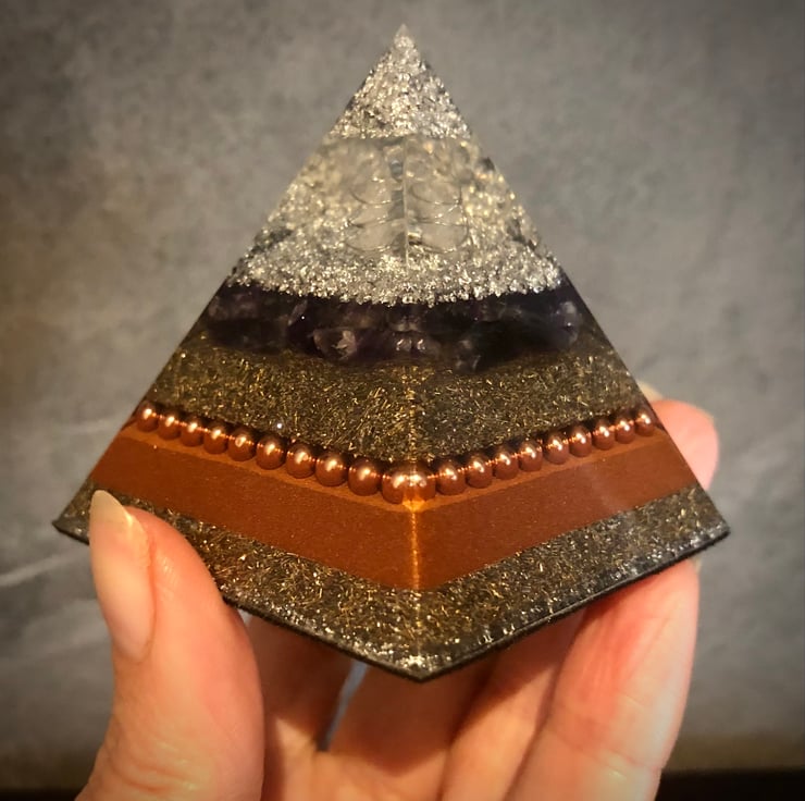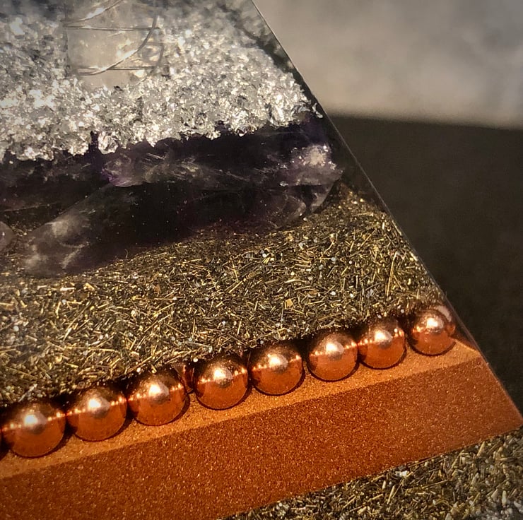 My Orgonite Pyramids are authentically made from resin, encasing a variety of metals and crystals. In this piece a Clear Quartz crystal wand runs vertically through the centre of the pyramid (only the tip will be visible) with Amethyst Quartz presented in one of the layers. Metal shavings, silver leaf and copper powder have been incorporated along with copper coated ball bearings and copper wire Triskelion symbol cut and 1/2 the sacred cubit length buried deep into the mix. The Triskelion helps circulate the energy and acts as a conduit increasing the Orgonite's power.