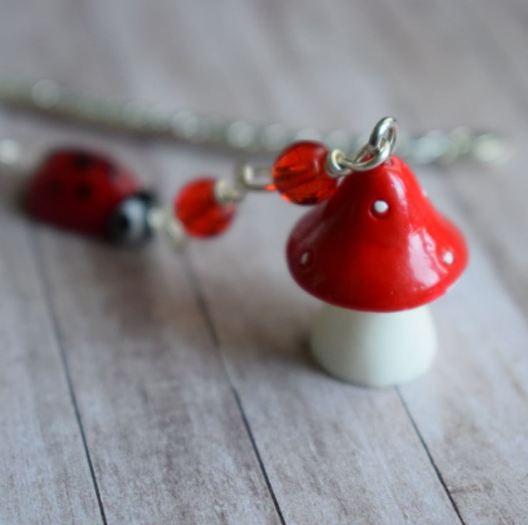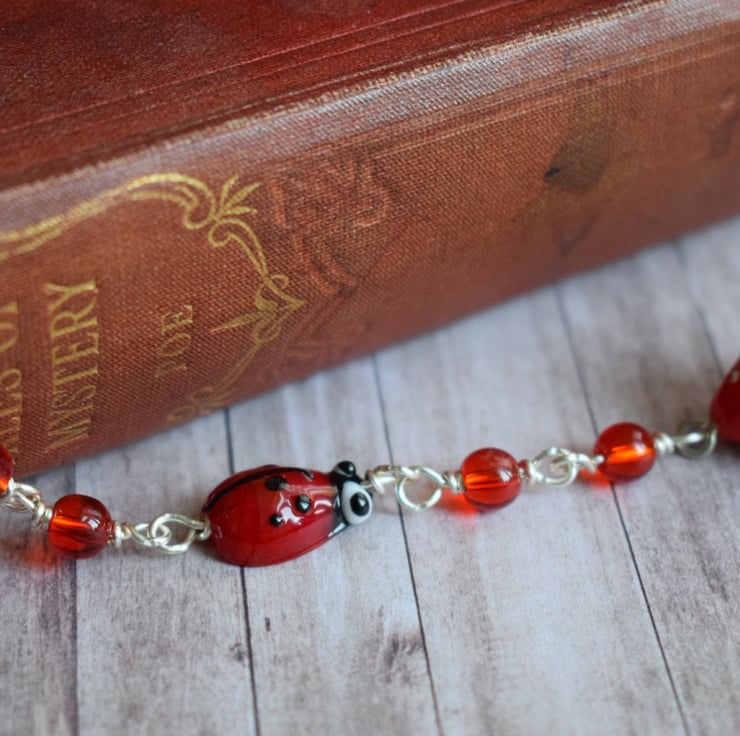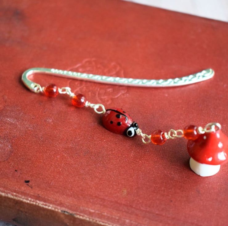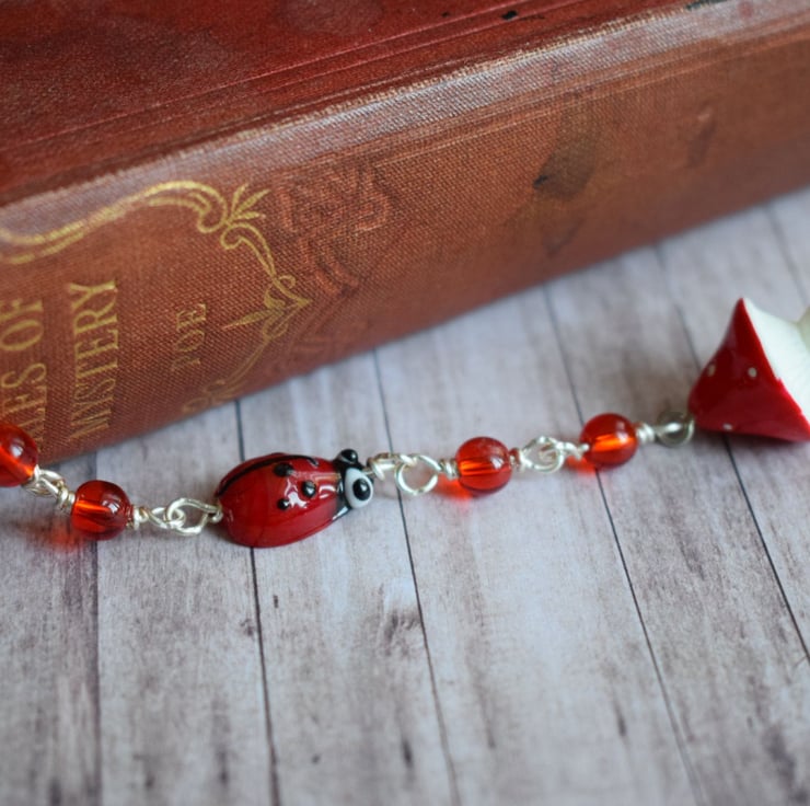 The silverplated hook part of the bookmark that ges inside your book is approx 3.5 inches long and the beaded section is a little longer at around 4.5 inches. It has a pair of red glass beads above a lampwork glass ladybird/ladybug and then another pair of glass beads above a little resin toadstool in vibrant red and white. Such a sweet way to mark your page and it would also make a great little gift for a book lover too.