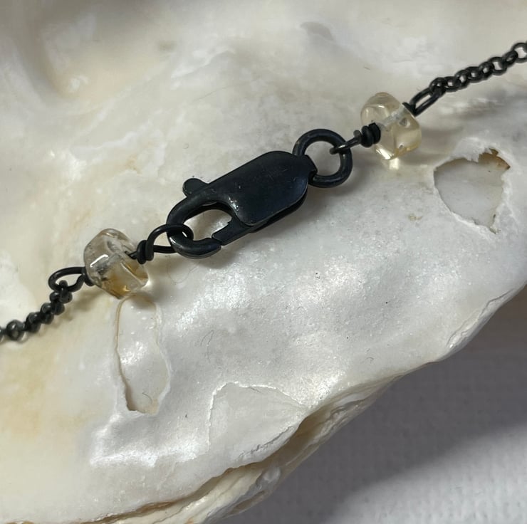 The bead section measures 6” and is wire wrapped on to rolo chain, fastening with a lobster clasp, accented either side by pale carnelian rondelles.