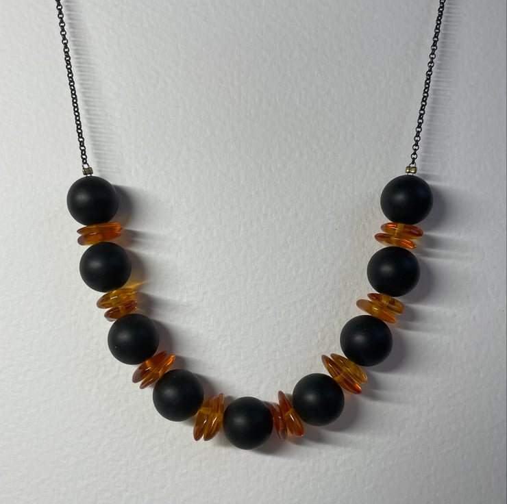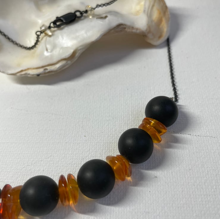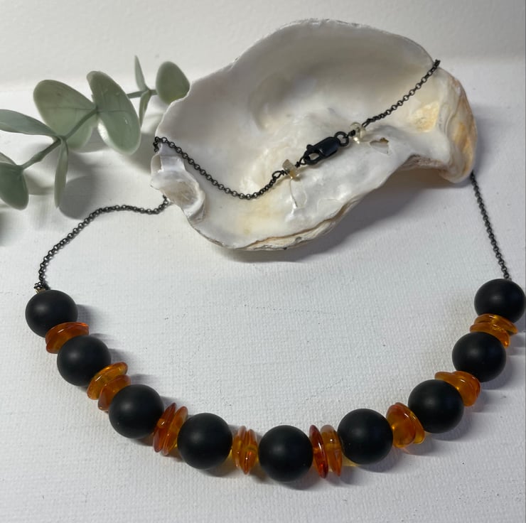 Matt black onyx beads have been threaded onto sterling silver wire and are alternated with pretty slices of burnt orange amber.