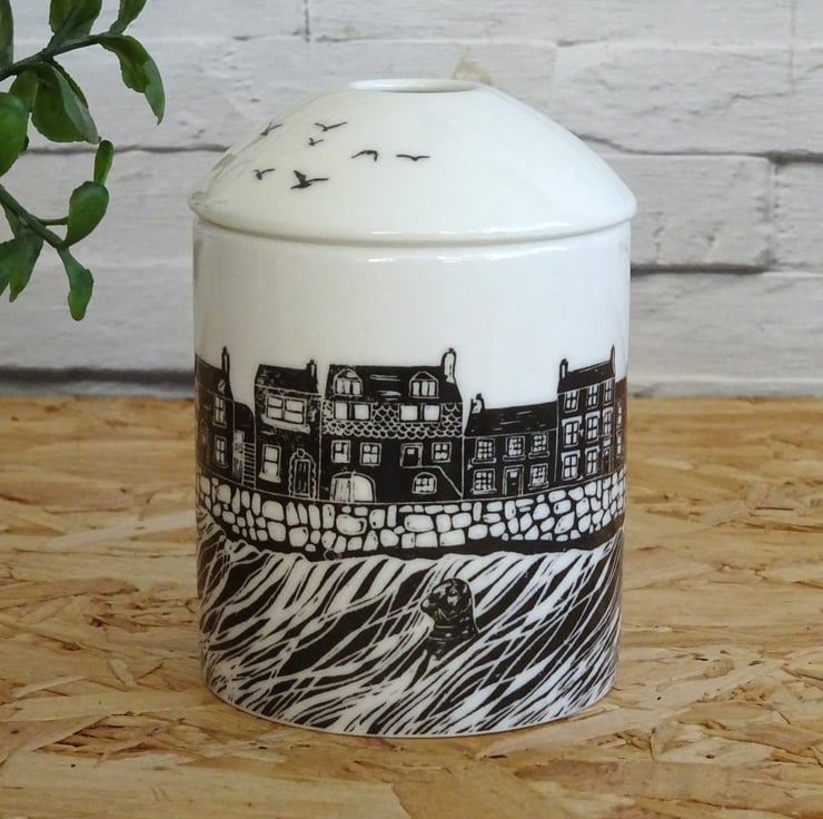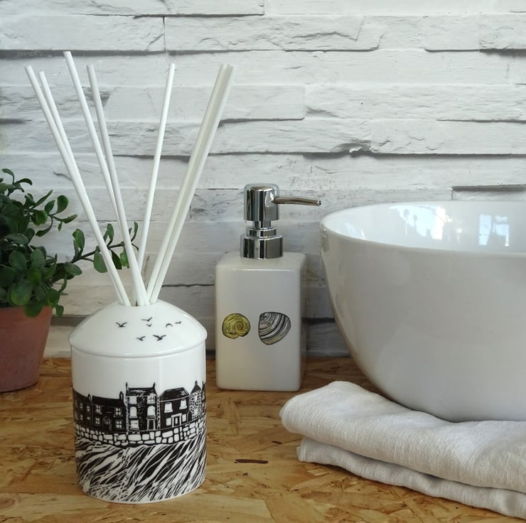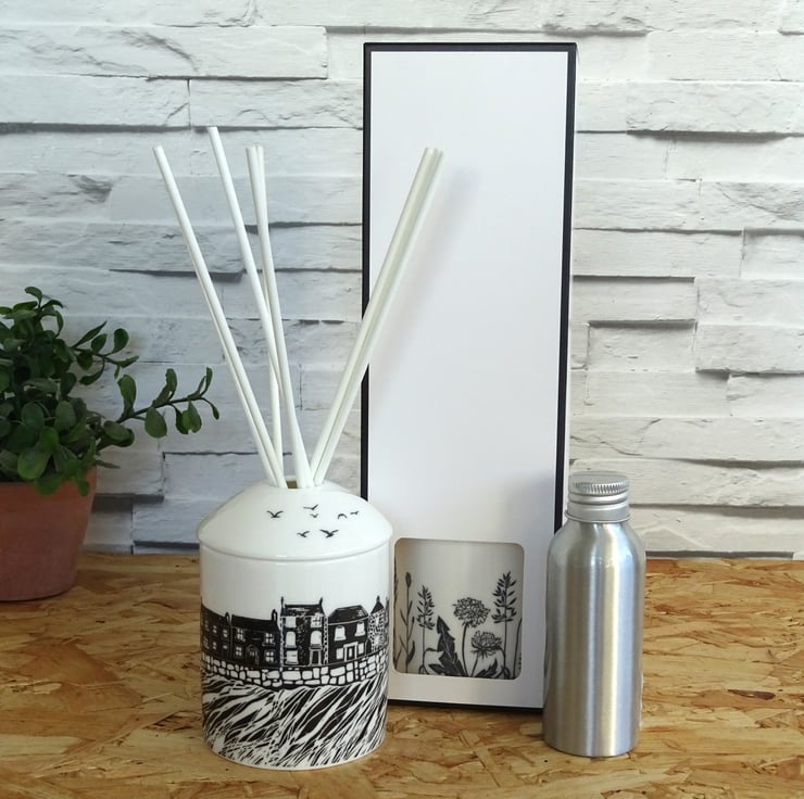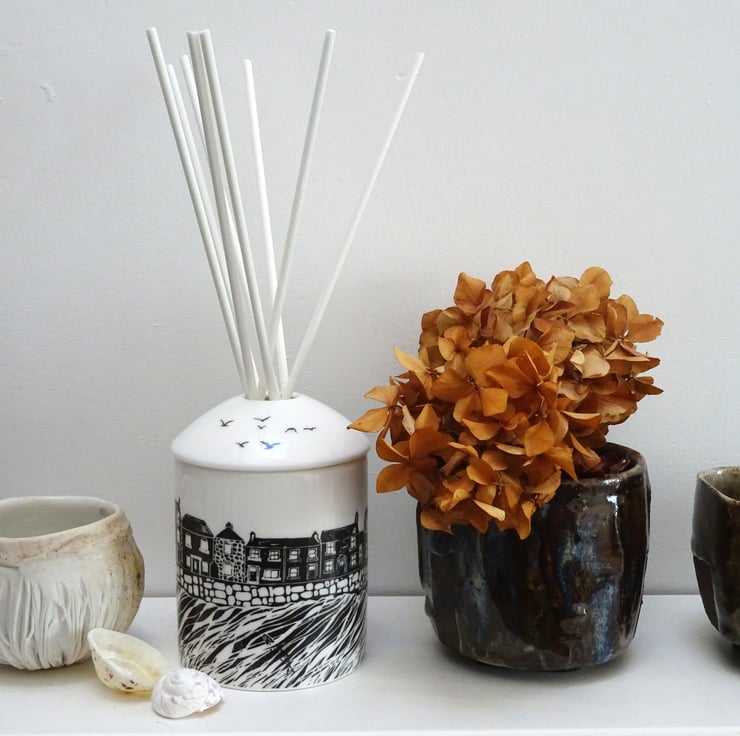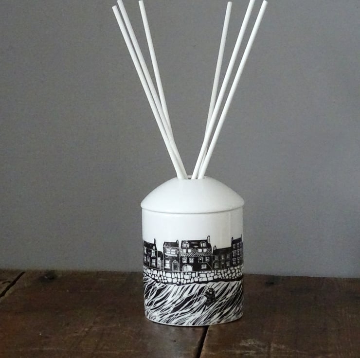 The design on this diffuser is taken from one of my original lino cuts, inspired by the many little Cornish villages with their eclectic collection of buildings.