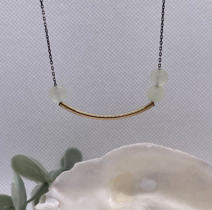 Three Soo Chow beads and a gold filled tube slide freely along an oxidised sterling silver chain which fastens with a sterling silver lobster clasp.
