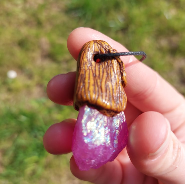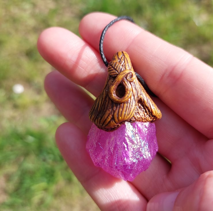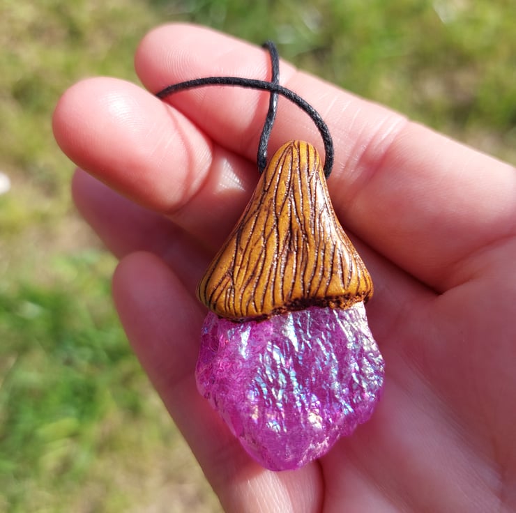 Unicorn stone (metal-plated quartz) with clear quartz Autumn treasure pendant.