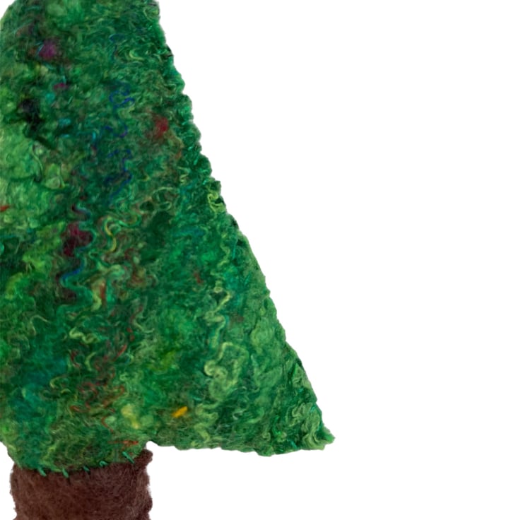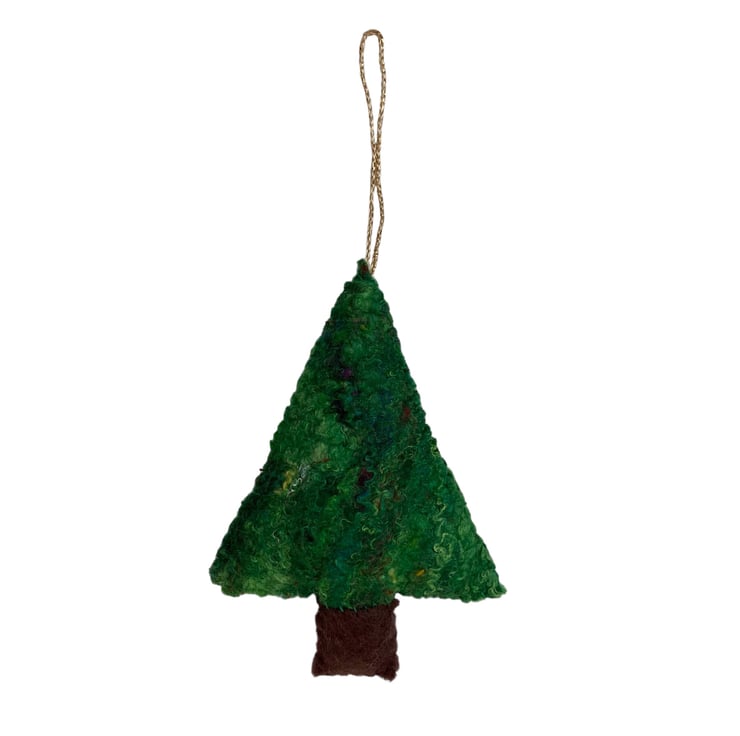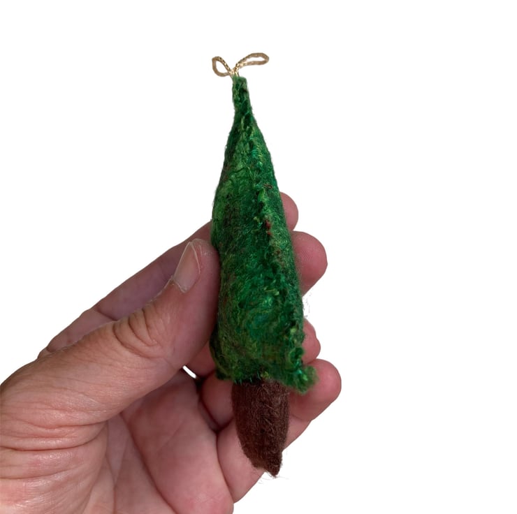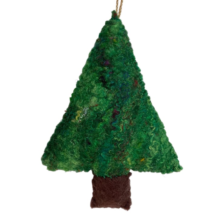 This pretty little Christmas tree can be used as a hanging decoration. It has been made using a piece of hand made felt created from woollen fibres topped with coloured silk fibres. The resulting felt piece has been cut to size, hand stitched and lightly stuffed with toy stuffing material. A golden coloured hanging thread has been attached.