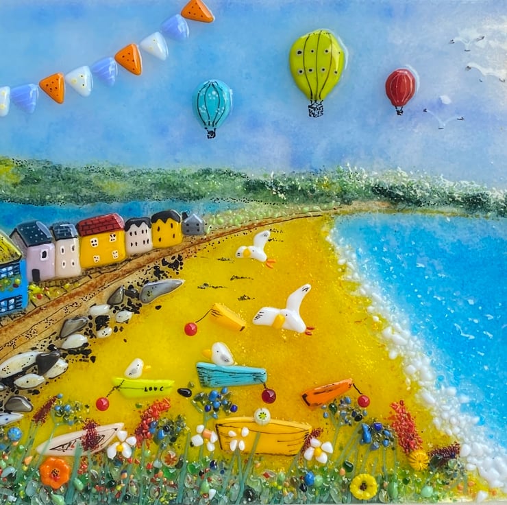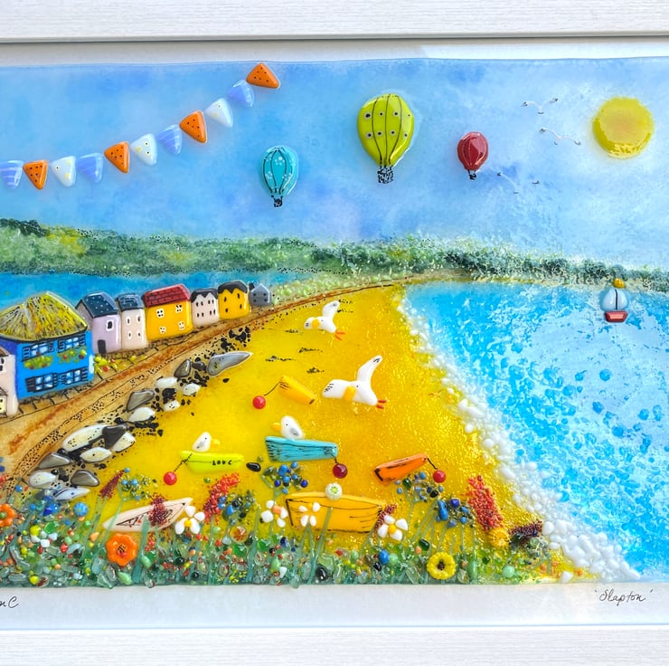 A beautiful 3dimensional fused glass landscape picture of slapton sands , tor cross in Devon. All made from sheet glass and framed ready to hang . An image of summer in Devon . Frame size 33 cm x45 cm. This is an original one of of a kind art . Professionally mounted and strung .