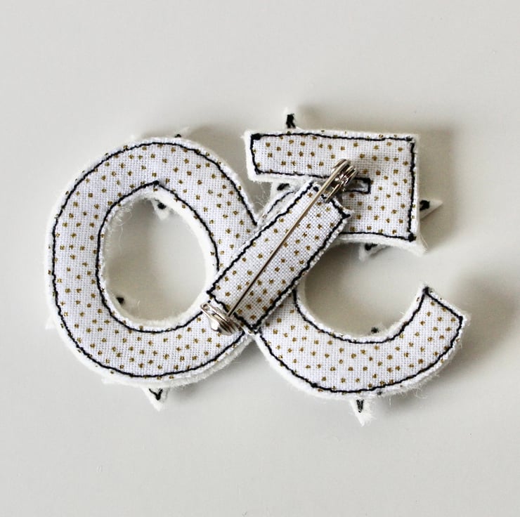 Birthday brooches are sewn using cotton cloth, 100% wool felt, glitter cloth and free hand machine embroidery; multiple layers of cloth are sewn together and cut out by hand using sharp scissors. The pins on the back are attached with hot glue, with a sewn fabric rectangle to secure.