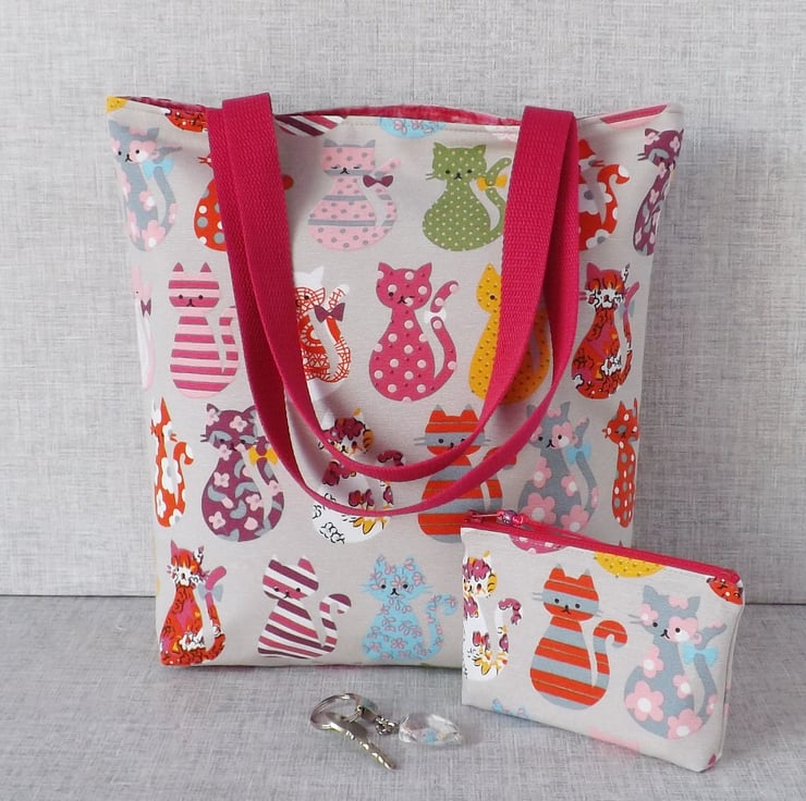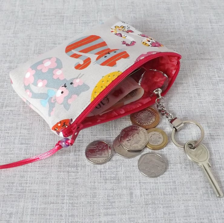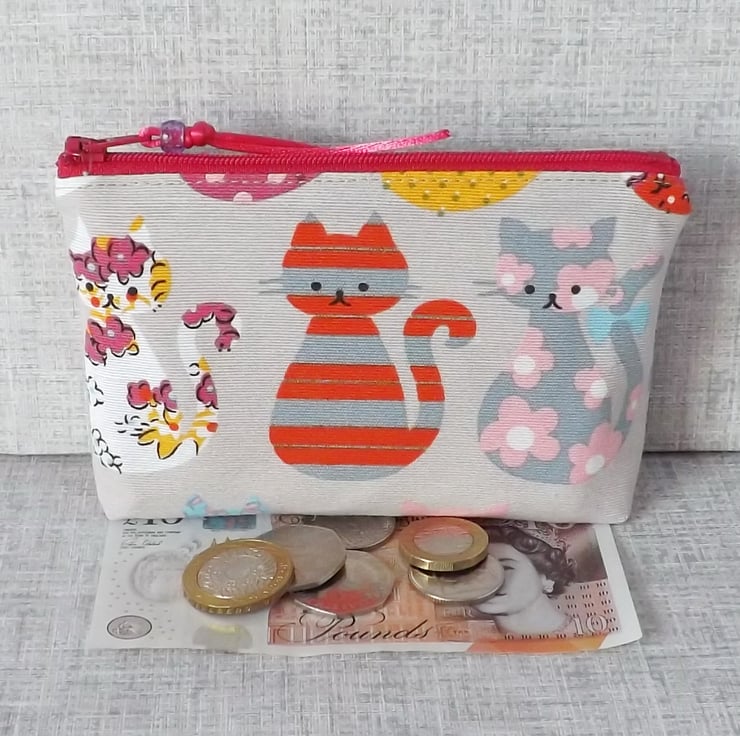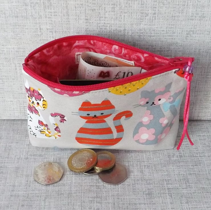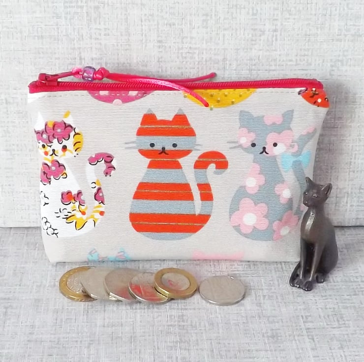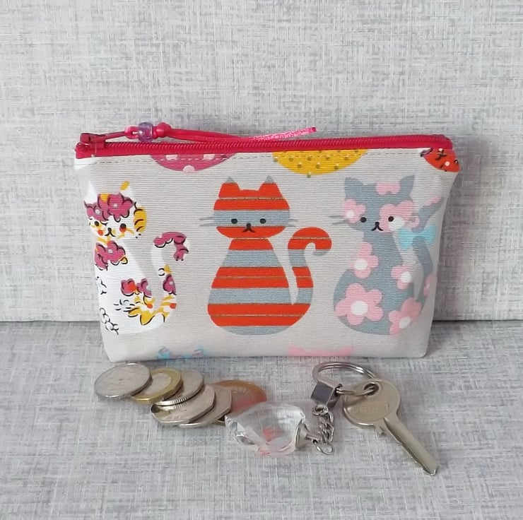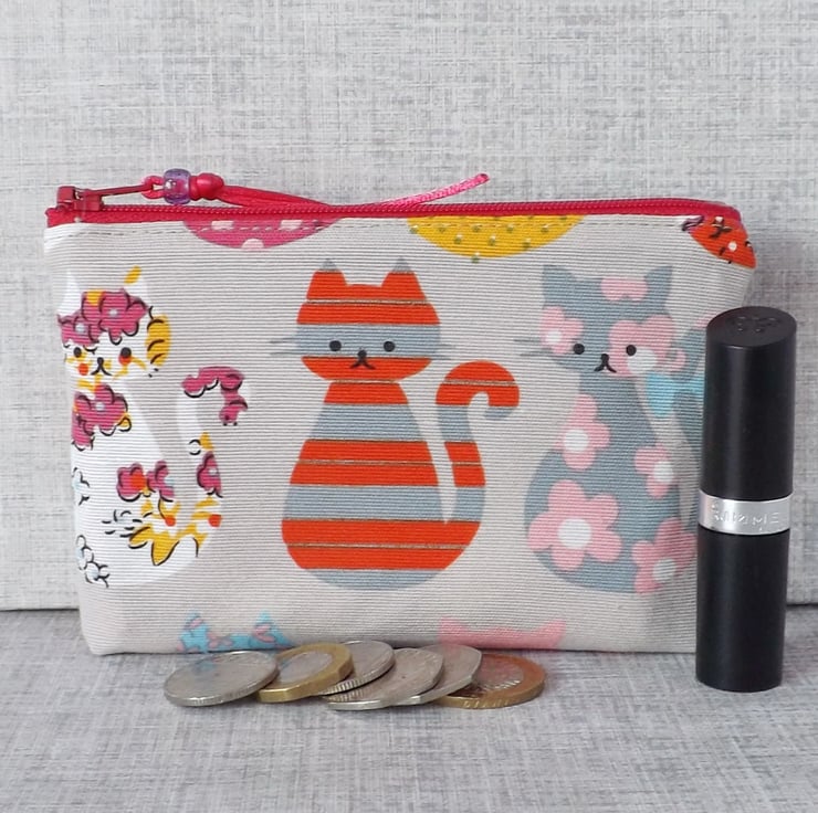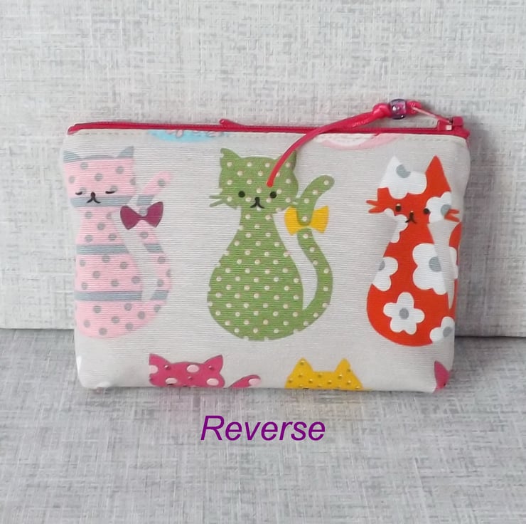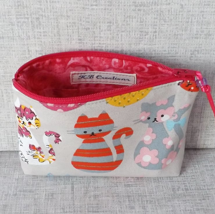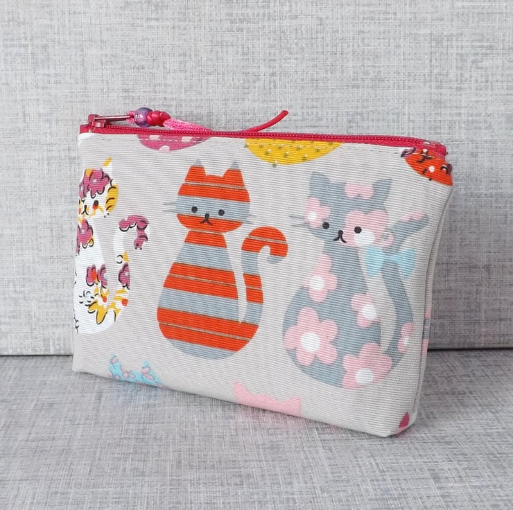 A medium size coin purse made from cotton canvas fabric with a cat design in various shades of blue, pink, red, orange, green, purple & grey on a natural coloured background.