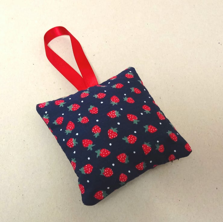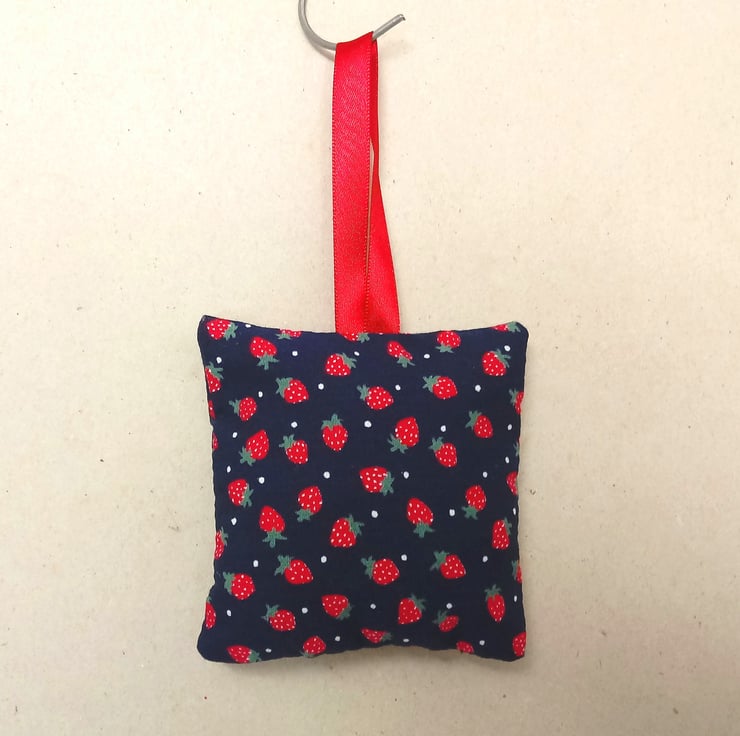 This is a lovely, single lavender bag in navy blue with red strawberries pattern.