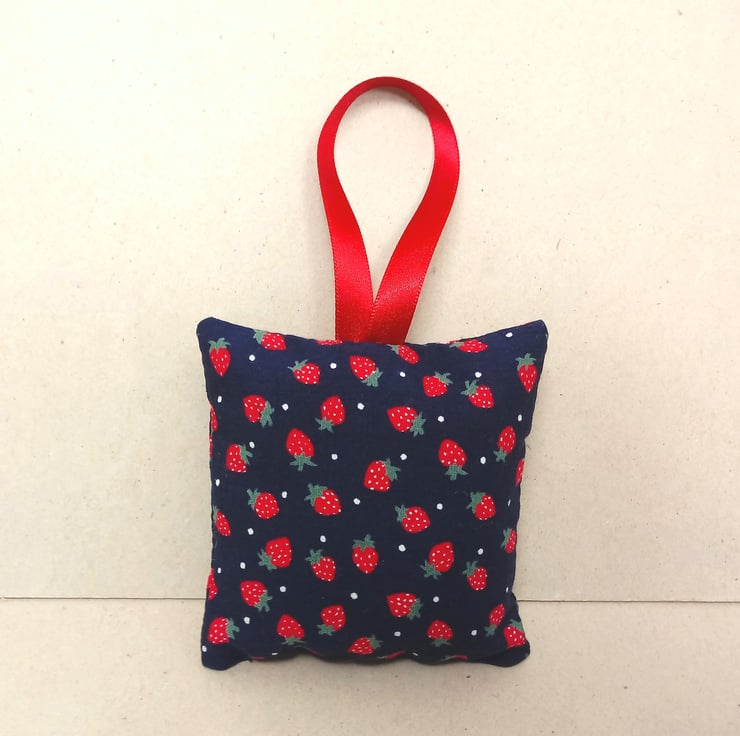 It has a matching red hanging ribbon and handmade using cotton fabric.